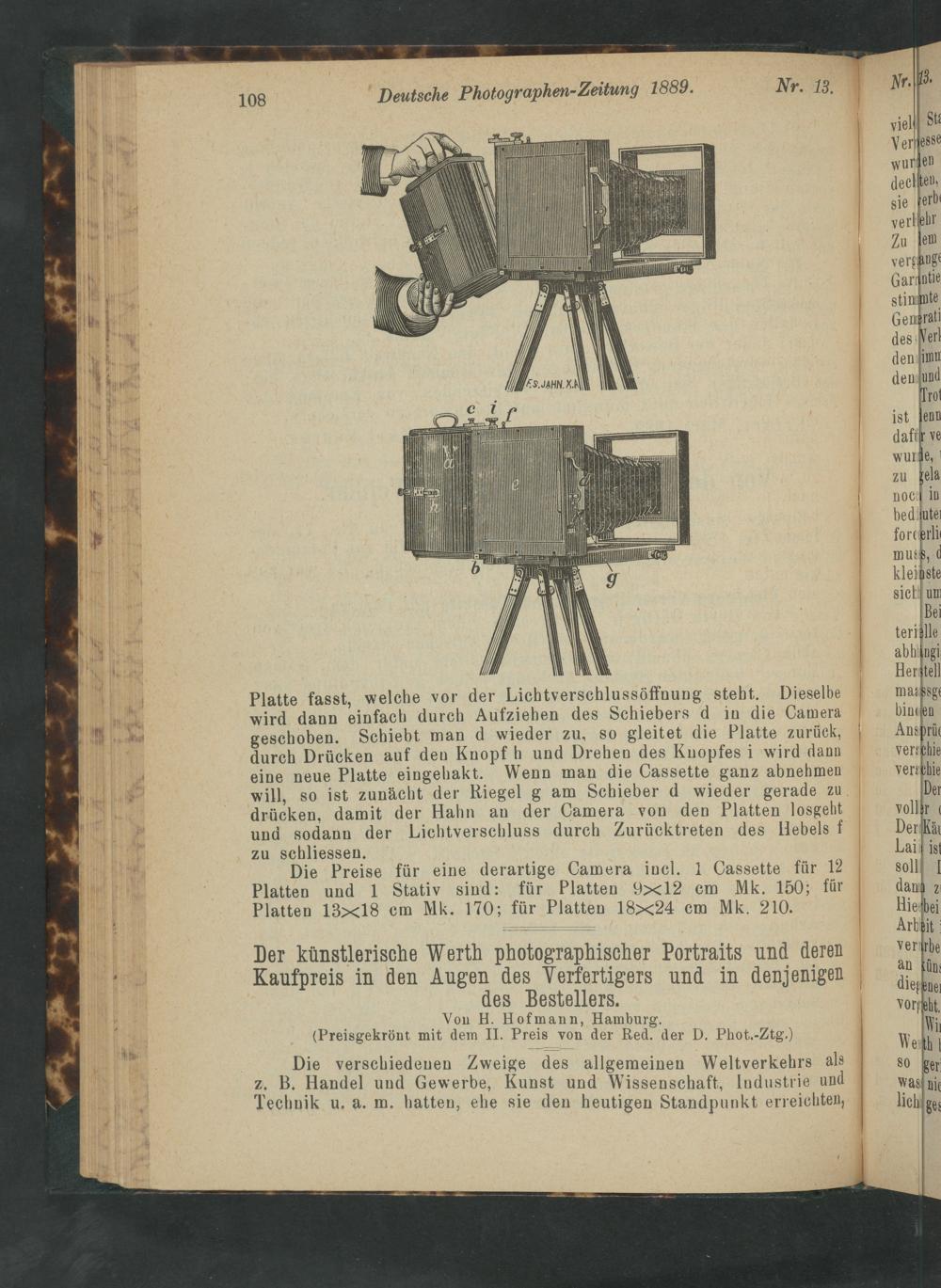 Die Preise für eine derartige Camera incl. 1 Cassette für 12 Pplatten und 1 Stativ sind: für Platten 9212 em Mk. 150; für Platten 132118 em Mk. 170; für Platten 18224 cm Mk. 210.