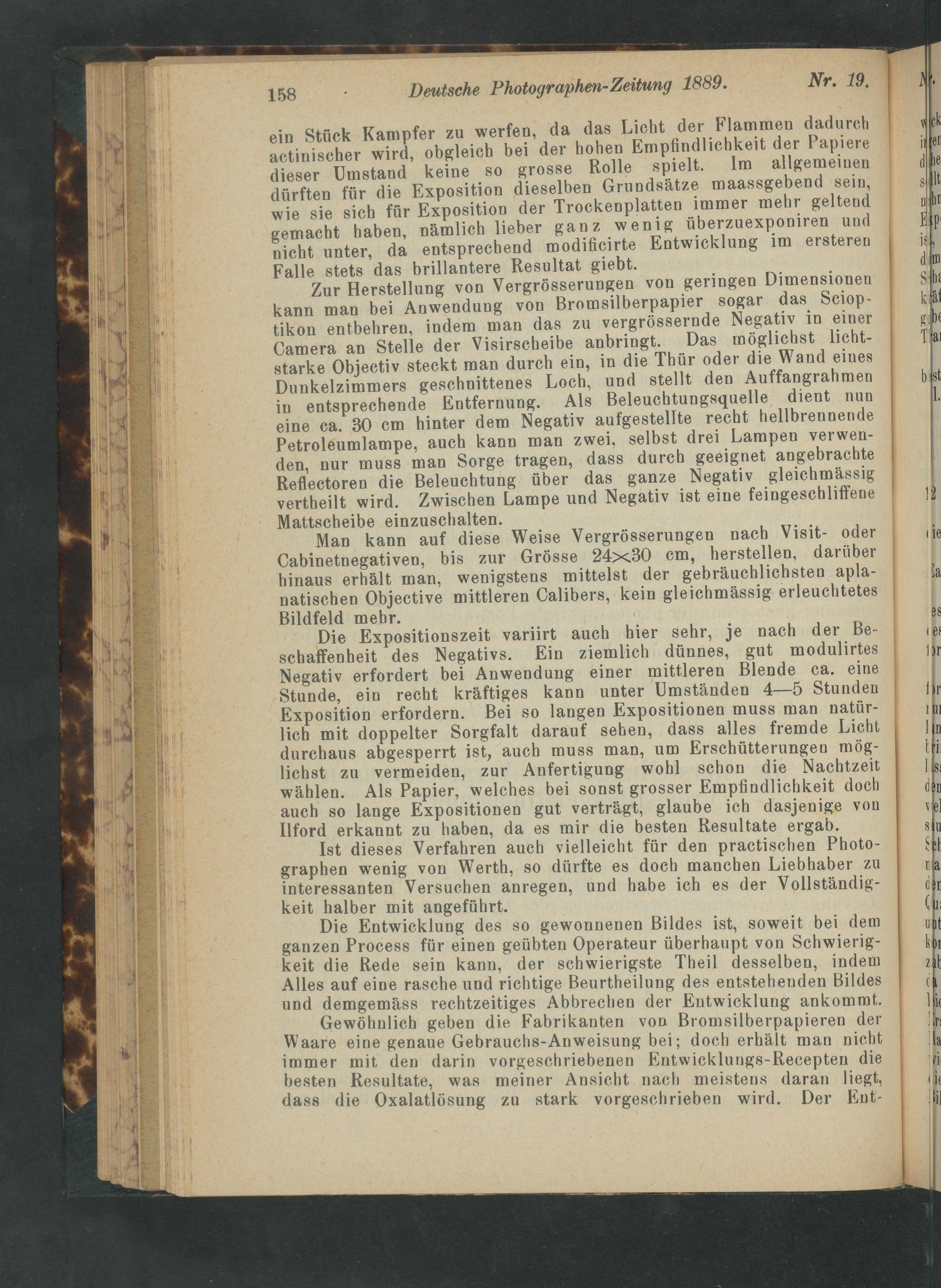 ein Stück Kampfer zu werfen, da das Lieht der Flammen dadurch actinischer wird, obgleich bei der hohen Empfindlichkeit der Papiere dieser Umstand keine so grosse Rolle spielt. Im allgemeinen dürften für die Exposition dieselben Grundsätze maassgebend sein, wie sie sich für Exposition der Trockenplatten immer mehr geltend gemacht haben, nämlich lieber ganz wenig überzuexponiren und nicht unter, da entsprechend modificirte Entwicklung im ersteren Falle stets das brillantere Resultat giebt.—