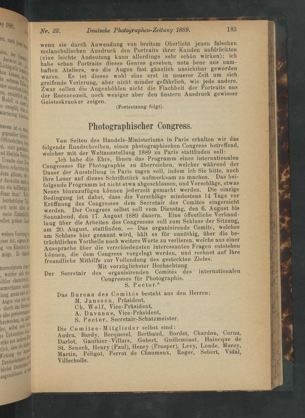 „lch habe die Ehre, Ihnen das Programm eines internationalen Congresses für Photographie zu überreichen, welcher während der Dauer der Ausstellung in Paris tagen soll, indem ich Sie bitte, auch Ihre Leser auf dieses Schriftstück aufmerksam zu machen. Das bei- folgende Programm ist nicht etwa abgeschlossen, und Vorschläge, etwas Neues hinzuzufügen können jederzeit gemacht werden. Die einzige Bedingung ist dabei, dass die Vorschläge mindestens 14 Tage vor Eröffnung des Congresses dem Secretair des Comités eingereicht werden. Der Congress selbst soll vom Dienstag, den 6. August bis Sonnabend, den 17. August 1889 dauern. Eine öffentliche Verhand- lung über die Arbeiten des Congresses soll zum Schluss der Sitzung, am 20. August, stattfinden.— Das organisirende Comité, welches am Schluss hier genannt wird, hält es für unnöthig, über die be- trächtlichen Vortheile noch weitere Worte zu verlieren, welche aus einer Aussprache über die verschiedensten interessanten Fragen entstehen können, die dem Congress vorgelegt werden, und rechnet auf Ihre freundliche Mithilfe zur Vollendung des gesteckten Zieles.