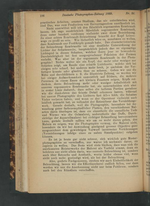 lassen, ich sage ausdrücklich fälschlich sogenannten Rembrandt, denn unter hundert verdienen vielleicht zwei diese Bezeichnung. Zu einer echten Rembrandt-Beleucbtung braucht der Kopf keines- wegs en profil zu sein. Wie lächerlich wäre es, annehmen zu vollen, dass Rembrandt nur Profilköpfe gemalt habe. Das characteristischste der Beleuchtung Rembrandts ist eine deutliche Unterordnung der Lichter der Schattenseite, hauptsächlich jedoch das so eigenartige Lichtspiel in diesen Schatten, welches ihnen jene so bewunderte Durchsichtigkeit bei fest ausgesprochener Präcision der Formen verleiht. Was aber ist der sogenannte Rembrandt in der Photo- graphie? Nichts weiter als ein Kopf, der mehr oder weniger nur Schatten zeigt, am Rande eine scharfe Lichtkante, welche sich bei einigen sehr scharf, bei anderen mehr breit, je nachdem der Ver- fertiger konnte oder glaubte thun zu müssen. Geben wir uns die Mühe und durchblättern z. B. die Illustrirte Zeitung, so werden wir bei einiger Aufmerksamkeit namentlich auf Bildern, die mehrere personen in einem Raum mit kleinen Fenstern zeigen, Köpfe ent- decken, deren Beleuchtung mehr oder weniger Aehnlichkeit mit unseren sogenannten Rembrandts hat, sie unterscheiden sich aber in erster Linie dadurch, dass selbst die hellsten Partien geradeso wie die dunkelsten das feinste Detail erkennen lassen, während bei unsrer Photographie den Lichtern fast Alles fehlt, die Schatten Vieles verloren haben, und wenn es der Operateur vielleicht noch leidlich gemacht hat, so vollendet der Retoucheur das Vernichtungs- werk. Gerade deshalb, weil die Photographie, besonders bei An- wendung guter farbenempfindlicher Platten, den verschiedenen Mal- arten darin überlegen ist, dass sie einestheils die unendliche Tiefe und Wärme wie die Oelmalerei, anderntheils das Duffe, Durch- sichtige der Aquarellmalerei bei richtiger Behandlung hervorzaubern kann, gerade deshalb sollten wir um so mehr daran gehen, den Malern zu zeigen, was die Photographie vermag, die Malerei nicht, besonders da wir bei Anwendung genügend grosser Objective ganz ausgezeichnet dem gewichtigen Vorwurf incorrecter Verkürzungen (Verzeichnungen infolge eines zu nahen Standpunktes) entgehen können.