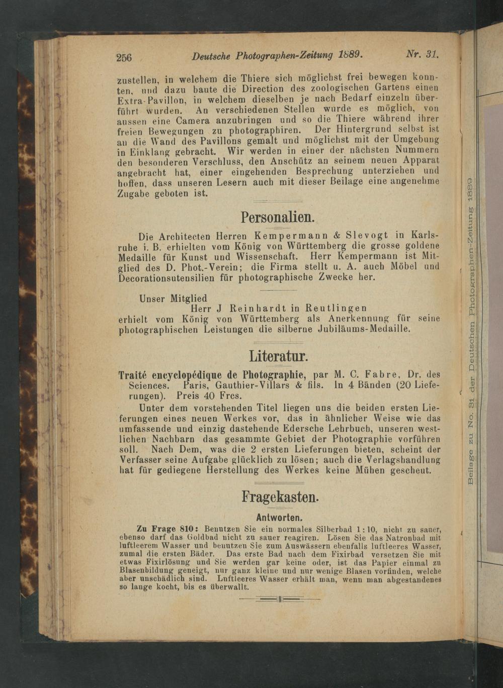 Zu Frage 810: Benutzen Sie ein normales Silberbad 1:10, nicht zu sauer, ebenso darf das Goldbad nicht zu sauer reagiren. Lösen Sie das Natronbad mit luftleerem Wasser und benutzen Sie zum Auswässern ebenfalls luftleeres Wasser, zumal die ersten Bäder. Das erste Bad nach dem Fixirbad versetzen Sie mit etwas Fixirlösung und Sie werden gar keine oder, ist das Papier einmal zu Blasenbildung geneigt, nur ganz kleine und nur wenige Blasen vorfinden, welche aber unschädlich sind. Luftleeres Wasser erhält man, wenn man abgestandenes so lange kocht, bis es überwallt.