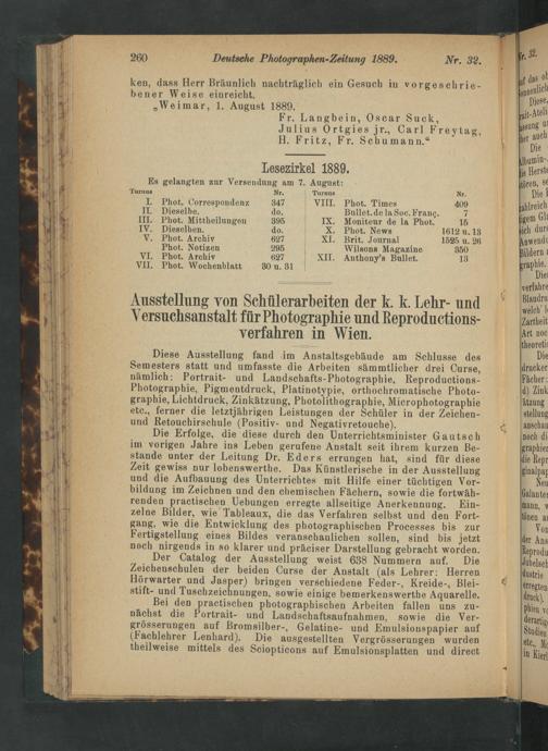 Diese Ausstellung fand im Anstaltsgebäude am Schlusse des Semesters statt und umfasste die Arbeiten sämmtlicher drei Curse, nämlich: Portrait- und Landschafts-Photographie, Reproductions- Photographie, Pigmentdruck, Platinotypie, orthochromatische Photo- graphie, Lichtdruck, Zinkätzung, Photolithographie, Mierophotographie etc., ferner die letztjährigen Leistungen der Schüler in der Zeichen- und Retouchirschule(Positiv- und Negativretouche).
