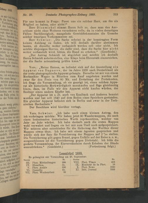 Vors.:„Meine Herren, es befindet sich auf der Ausstellung ein Apparat von Daguerre, der im Jabre 1839 nach Deutschland als der erste photographische Apparat gelangte. Derselbe ist mir von einem för einen Brege Mechaniker Wagus in NMünchen zum Kauf angeboten worden und mdegts Nae h.... 2War für den Preis von 80 Mk. und Erstattung der Portokosten. moehie gegeu dai Ich frage die Versammlung, ob sie geneigt ist, einen solchen Appa- ge, dis ein gerieite rat als historische Merkwürdigkeit anzukaufen und füge gleichzeitig ein Gerieht wiengm hinzu, dass, im Falle wir den Apparat nicht kaufen würden, der heiten erst in min Besitzer einen andern Käufer hat. 2m Falle prinat. ha„Der Apparat ist s. Zt. auch von Kaulbach und Anderen benutzt e der Verein äuuk worden und hat seit 1849 auf dem Boden eines Speichers gestanden.