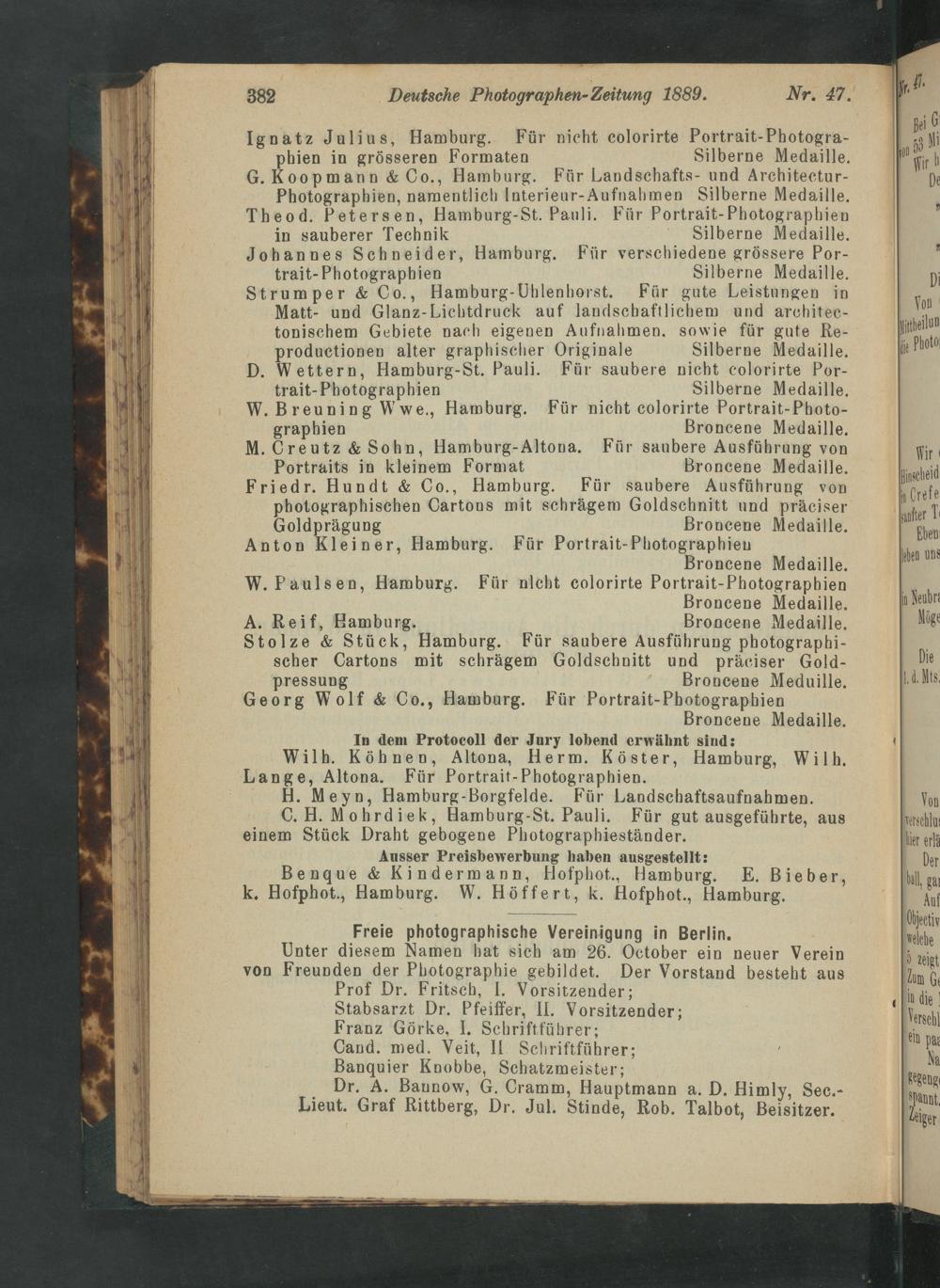 productionen alter graphischer Originale Silberne Medaille. D. Wettern, Hamburg-St. Pauli. Für saubere nicht colorirte Por- trait-Photographien— Silberne Medaille. W. Breuning Wwe., Hamburg. Für nicht colorirte Portrait-Photo- graphien Broncene Medaille. M. Greutz& Sohn, Hamburg-Altona. Für saubere Ausfübrung von Portraits in kleinem Format Broncene Medaille. Friedr. Hundt& Co., Hamburg. Für saubere Ausführung von photographischen Cartons mit schrägem Goldschnitt und präciser Goldprägung Broncene Medaille. Anton Kleiner, Hamburg. Für Portrait-Photographien Broncene Medaille. W. Paulsen, Hamburg. Für nlcht colorirte Portrait-Photograpbien Broncene Medaille. A. Reif, Hamburg. Broncene Medaille. Stolze& Stück, Hamburg. Für saubere Ausführung photographi- scher Cartons mit schrägem Goldschnitt und präciser Gold- pressung Broncene Meduille. Georg Wolf& Co., Hamburg. Für Portrait-Photographien Broncene Medaille. In dem Protocoll der Jury lobend erwähnt sind: Wilh. Köhnen, Allttona, Herm. Köster, Hamburg, Wilh. Lange, Altona. Für Portrait-Photographien. H. Meyn, Hamburg-Borgfelde. Für Landschaftsaufnahmen. C. H. Mohrdiek, Hamburg-St. Pauli. Für gut ausgeführte, aus einem Stück Draht gebogene Photographieständer. Ausser Preisbewerbung haben ausgestellt: Benque& Kindermann, Hofphot., Hamburg. E. Bieber, k. Hofphot., Hamburg. W. Höffert, k. Hofphot., Hamburg. Freie photographische Vereinigung in Berlin. Unter diesem Namen hat sich am 26. October ein neuer Verein von Freunden der Photographie gebildet. Der Vorstand besteht aus Prof Dr. Fritsch, I. Vorsitzender; Stabsarzt Dr. Pfeiffer, II. Vorsitzender; Franz Görke, I. Schrift führer; Cand. med. Veit, II. Schriftführer; Banquier Knobbe, Schatzmeister; Dr. A. Bannow, G. Cramm, Hauptmann a. D. Himly, Sec.- Lieut. Graf Rittberg, Dr. Jul. Stinde, Rob. Talbot, Beisitzer.