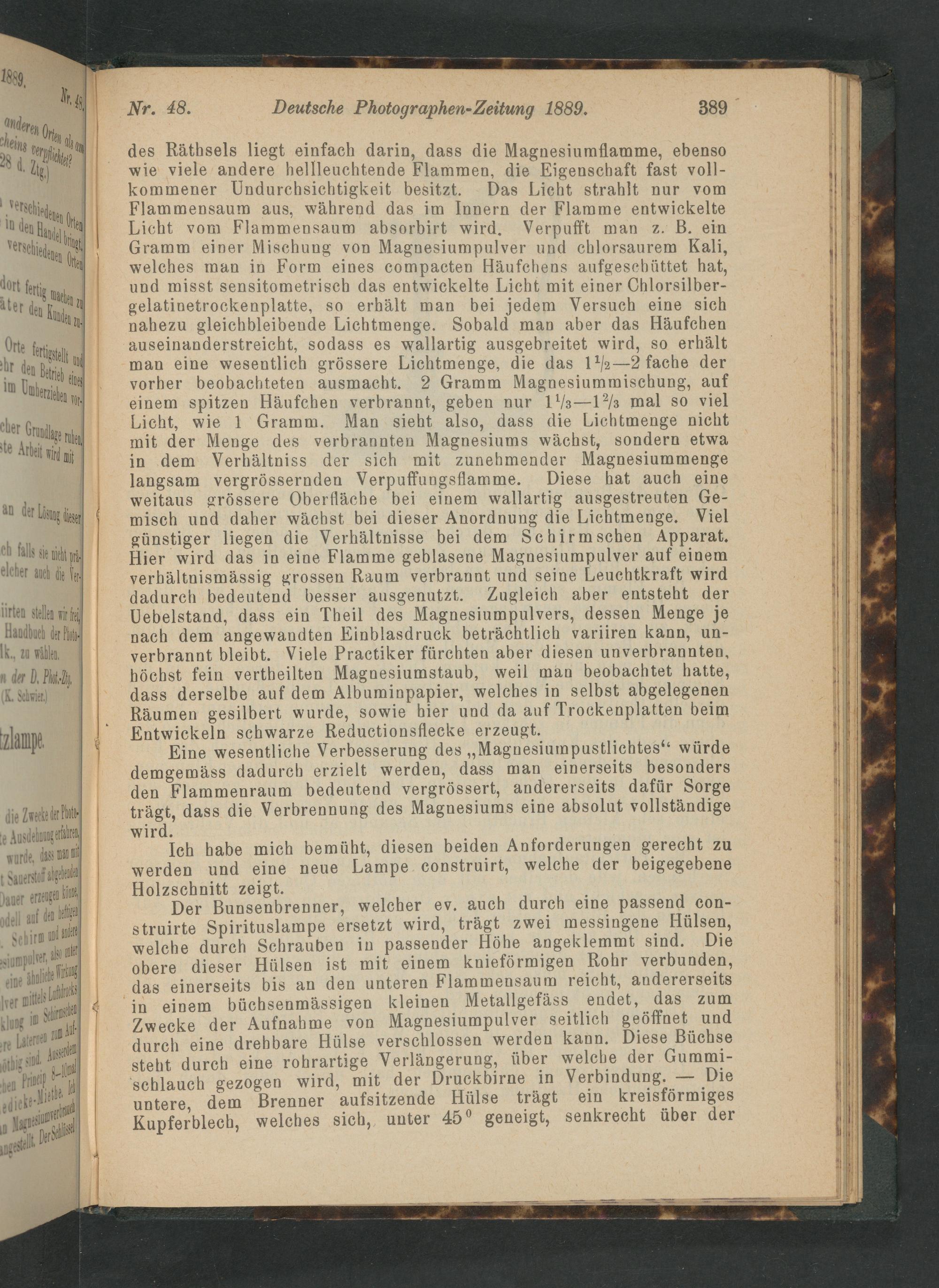 des Rätbsels liegt einfach darin, dass die Magnesiumflamme, ebenso wie viele andere hellleuchtende Flammen, die Eigenschaft fast voll- kommener Undurchsichtigkeit besitzt. Das Licht strahlt nur vom Flammensaum aus, während das im Innern der Flamme entwickelte Licht vom Flammensaum absorbirt wird. Verpufft man z. B. ein Gramm einer Mischung von Magnesiumpulver und chlorsaurem Kali, welches man in Form eines compacten Häufchens aufgeschüttet hat, und misst sensitometrisch das entwickelte Licht mit einer Chlorsilber- gelatinetrockenplatte, so erhält man bei jedem Versuch eine sich nahezu gleichbleibende Lichtmenge. Sobald man aber das Häufchen auseinanderstreicht, sodass es wallartig ausgebreitet wird, so erhält man eine wesentlich grössere Lichtmenge, die das 1 ½— 2 fache der vorher beobachteten ausmacht. 2 Gramm Magnesiummischung, auf einem spitzen Häufchen verbrannt, geben nur 1— 1 mal so viel Liceht, wie 1 Gramm. Man sieht also, dass die Lichtmenge nicht mit der Menge des verbrannten Magnesiums wächst, sondern etwa in dem Verbältniss der sich mit zunehmender Magnesiummenge langsam vergrössernden Verpuffungsflamme. Diese hat auch eine weitaus grössere Oberfläche bei einem wallartig ausgestreuten Ge- misch und daher wächst bei dieser Anordnung die Lichtmenge. Viel günstiger liegen die Verhältnisse bei dem Schirmschen Apparat. Hier wird das in eine Flamme geblasene Magnesiumpulver auf einem verhältnismässig grossen Raum verbrannt und seine Leuchtkraft wird dadurch bedeutend besser ausgenutzt. Zugleich aber entsteht der Uebelstand, dass ein Theil des Magnesiumpulvers, dessen Menge je nach dem angewandten Einblasdruck beträchtlich variiren kann, un- verbrannt bleibt. Viele Practiker fürchten aber diesen unverbrannten, höchst fein vertheilten Magnesiumstaub, weil man beobachtet hatte, dass derselbe auf dem Albuminpapier, welches in selbst abgelegenen Räumen gesilbert wurde, sowie hier und da auf Trockenplatten beim Entwickeln schwarze Reductionsflecke erzeugt.
