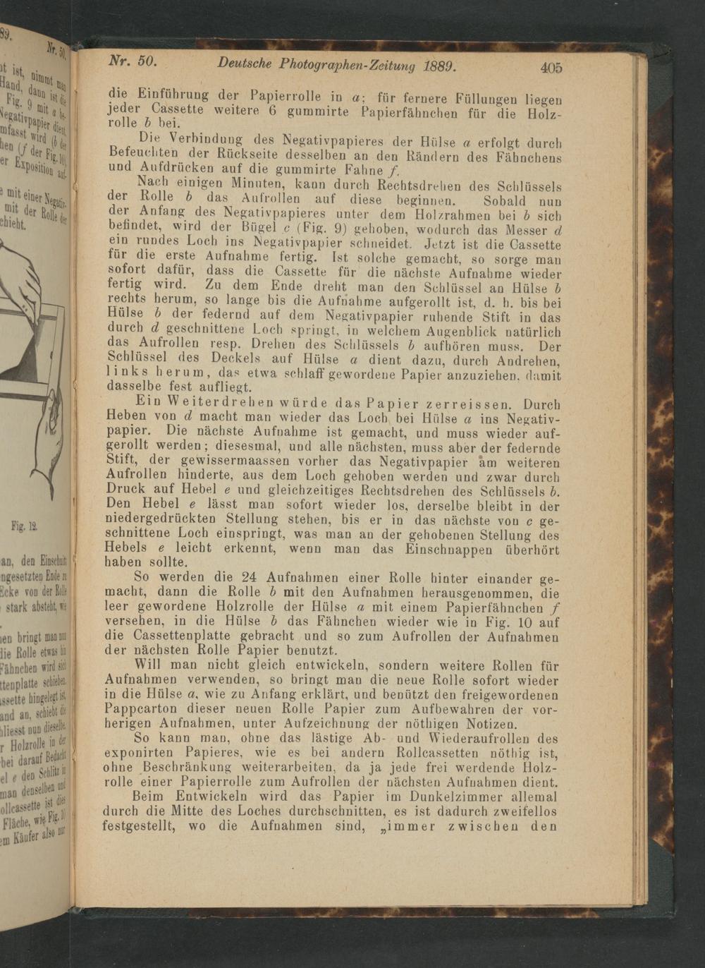 So werden die 24 Aufnahmen einer Rolle hinter einander ge- macht, dann die Rolle 5b 9 mit den Aufnahmen herausgenommen, die leer gewordene Holzrolle der Hülse a mit einem Papierfähnchen † versehen, in die Hülse 5 das Fähnchen wieder wie in Fig. 10 auf die Cassettenplatte gebracht und so zum Aufrollen der Aufnahmen der nächsten Rolle Papier benutzt.