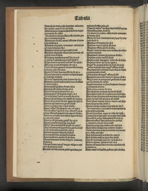 quãdo non. ibidem. Adulatoꝝ deteſtatio ponit᷑. ſer· xx.a.b Tautela ʒᷓ adulatoꝛes ponit. ibidẽ. b duocatos tres dedit nob debſer. xxij.c Affectus carnal eſt duplex.ſer. cix. a Quis affectus generet veram dilectioneʒ. ſermone.cxix. e.ſer.cix. a 6 Igenti bñ ſunt duo neceſſaria.ſer.xx.c. Agens bene debet creſcere in ſeptẽ pᷣcipu ⸗ is virtutib.ibidem. Alectoꝛꝰ lapis habʒ tres vᷣtutes.ſer. ix.c. Alimento quadruplici paſcit nos chꝛiſtus ſermone.Ixiiij. a Be. Zmen quid ſigniſicet.ſermo.iij. d Amicicia eſt triplex.ſermo x. d Amicicie pᷣconia ponunẽ᷑.ſer.c.c Zmicoꝝ genꝰ eſt duplex.ibidẽ.c.d.e In veris amic debẽt tria eſſe.ſer. xli.a moꝛẽ xp̃i ad aĩam tria oñdũt.ſer.xxxix.c. Amoꝛ dei in hoie ſũt tria ſigna.ſer.xxv b. Zmoꝛis xp̃i ſunt tres gracꝰ ibidẽ Amoꝛ iocũdus duo req;rit. ibidẽ Amoꝛ affectꝰ ſũt qͥnq;.ſer. cix. a.ð ꝙxix. e Bõoĩs affectꝰ generat veꝝ amoꝛẽf.cix.a. Quis affectuũ generet veꝝ amoꝛẽ.ibideʒ. Amoꝛis carnalis ſunt ſeptez ſigna.ſermo/ ne.cix.a.ſer.cxix.e Amoꝛis eſt qᷓ̃druplex gradꝰ.ſercix. d Amnare tenet᷑ hõ deñ ſuꝑ oĩa.ibidẽ AIffectꝰ amoꝛis ſpũal fittripłr.ſer. cxix. f Vtꝝ hõ debeat diligere hoieʒ ꝓpr ſe.ibidẽ ꝛdo dilectiõis ponit᷑ ſer. cxit.g Amoꝛis inceptio q̃lis ſit. ibidem Zmoꝛis ꝓfectus qualis ſit.ibidem Amoꝛis pfectio qualis ſit. ibidem. Vtrum teneatur homo diligere inimicuʒ Vtrum homo teneat᷑ magis diligere ami cumqᷓ; inimicũ.ibid e motis vel dilectionis pximi gradus po/