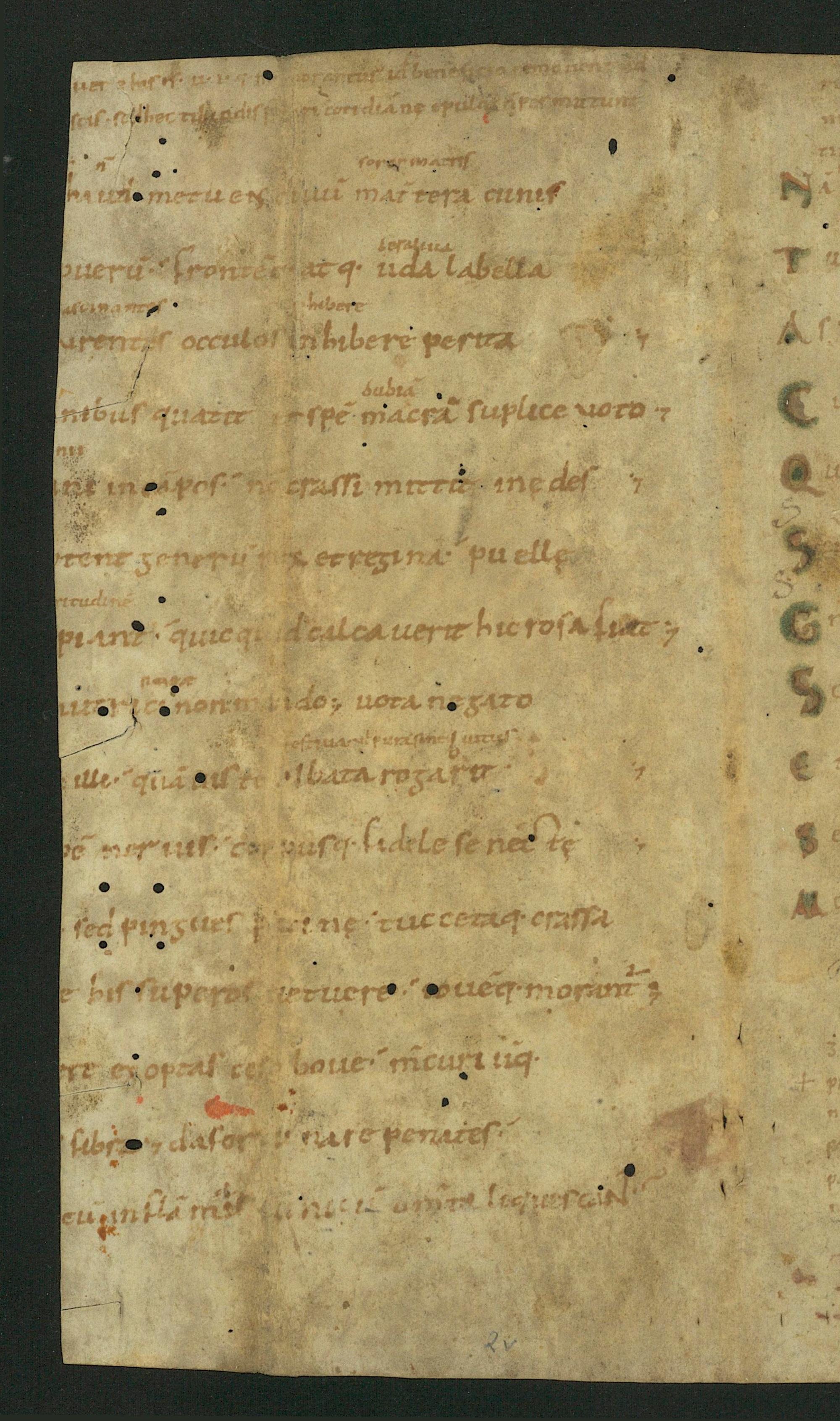 2v Persiustext 1,8-18 (Anfänge); 2, 31-47, Marginalscholien 1, 14-18 (Anfänge); 2, 42-43 (teilweise)