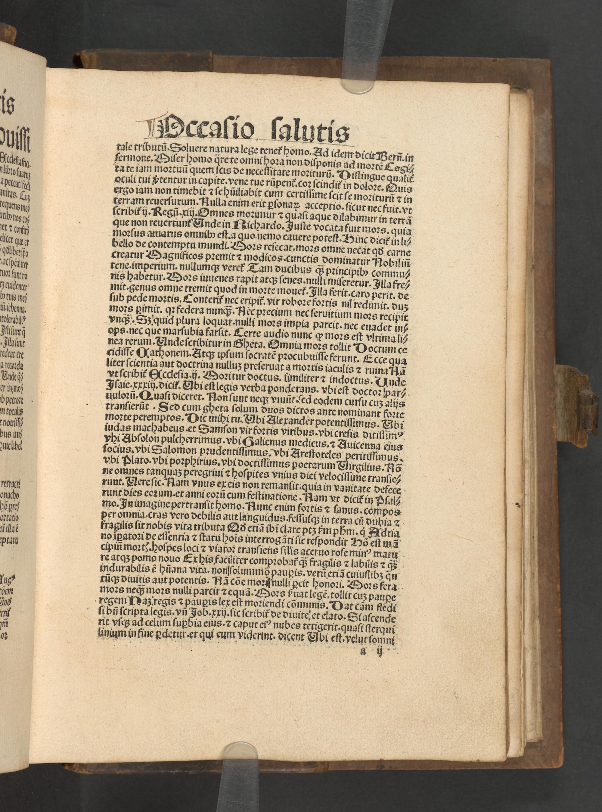 nea rerum. Vnde ſcribitur in Bheta. Smnia moꝛs tollit Doctum ce cidiſſe Qathonem. Atq; ipſum ſocratẽ pꝛocubuiſſe ferunt. Ecce qua liter ſcientia qut doctrina nulluʒ preſeruat moꝛtis iaculis ⁊ ruina Nã yt ſcribit&ccleſia.ij. Moꝛitur doctus. ſimiliter ⁊ indoctus.Inde Iſaie. xxxiij.· dicit. Gbi eſtlegis verba ponderans. vbieſt docto: par⸗ uuloꝛũ. Q.uaſi diceret. Non ſunt neq; viuũted eodem curſu cuʒ aiijs tranſierũt. Sed cum gheta ſolum duos dictos ante nominant foꝛte moꝛte peremptos. Dit mihi tu. Vjbi Alexander potentiſſimus. Vibi iudas machabeus. et Samſon vir foꝛtis viribus. vbi creſis ditiſſimꝰ vhi Abſolon pulcherrimus. vbi Galienus medicus.⁊ uicenna eius ſocius. vbi Salomon pꝛudentiſſimus. vbi Areſtoteles peritiſſimus. vbi Plato. vbi poꝛphirius.vbi doctiſſimus poetarum Virgilius. Nõ ne omnes tanquas peregriui ⁊ hoſpites vnius diei velociſſime tra nſie⸗ runt. Vere ſic. Nam vnus ex eis non remanlit. quia in vanitate defece runt dies ecꝛumet anni eoꝛũ cum feſtina tione. Nam vt dicit in Pſal⸗ mo. In imagine pertranſit homo. Nunc enim foꝛtis ⁊ ſanus. compos per omnia· cras vero debilis aut languidus feſſiſq; in terra ců dubia⁊ fragilis ſit nobis vita tributa Oð etiã ibiclare ptz ᷣmphm.q dria no ĩpatoꝛi de eſſentin ⁊ ſtatu hoĩs interrogãtiſic reſpondit Hõ eſt mã cipiũ moꝛtꝭ. hoſpes loci⁊ viatoꝛ tranſiens ſilis aceruo roſe minꝰ matu re atqʒ pomo nouo Ex his faciliter compꝛobat̃ qᷓ; fragilis ⁊ labilis ⁊ q5 indurabilis ẽ hñana vita. nonjſ olummõ paupꝑis.verũ etiã cuiuſlibʒ qᷓn