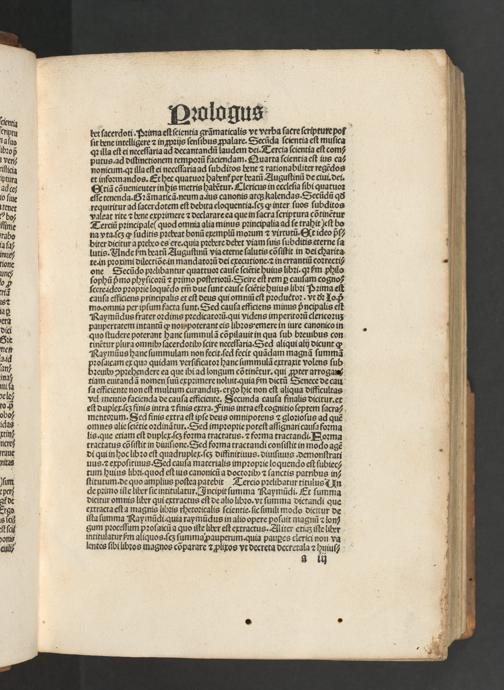 tet ſacerdoti Pꝛimaeſtſeientia grãmaticalis vt verba ſaere ſcriptutepor ſit bene intelligere ⁊ inʒpꝛijs ſenſibus ꝓpalare. Secũda ſcienria eſt muſica qꝛ ilia eſt ei neceſſaria ad decantandũ laudem dei. Tercia ſcientia eſt com⸗ putus · ad diſtinctionem tempoꝛũ faciendam. Quarta ſcientia eſt ius ca? nonicum. qꝛ illa eſtei neceſſaria ad ſubditos bene ⁊ rationabiliter regẽdos et infoꝛmandos. Et hec quatuoꝛ habent᷑ per beatũ Auguſtinũ de ciui.dei. Gtiã cõuenieuter inhis metris habẽtur· Clericus in eccleſia ſibi quatuoꝛ eſſe tenenda. Sꝛãmaticã.neuma.ius canonis atq; kalendas. Secũdũ qð requiritur ad ſacerdotem eſt debua eloquentia.ſcʒ ꝙ inter ſuos ſubditos valeat rite ⁊ bene expꝛimere ⁊ declarare ea que in ſacra ſcriptura cõtinẽtur Terciũ pꝛincipale(quod omnia alia minus pꝛincipalia ad ſe trahit ãeſt bo na vta. ſcʒ ꝙ ſuditis pꝛebeat bonũ exemplũ moꝛum ⁊ virtutũ. t ideo pᷣſ⸗ biter dicitur a pꝛebro es ere.quia pꝛebere debet viam ſuis ſubditis eterne ſa lutis. Vnde im beatũ Auguſtinũ viaeterne ſalutis cõſiſtit in deicharita te in pꝛoximi dilectiõe. in mandatoꝛũ dei executione.⁊ inerrantiũ coꝛrecti⸗ one Secũdo pꝛelibantur quattuoꝛ cauſe ſciẽtie huius libꝛi.qꝛ ᷣm philo ſophũ pᷣmo phyſicoꝛũ ⁊ pꝛimo poſterioꝛũ. Seire eſt remꝑ cauſam cogno⸗ ſcere.ideo pꝛopꝛie loquẽdo tm̃ due ſunt cauſe ſciẽtie huius libꝛi Pꝛima eſt cauſa efficiens principalis et eſt deus qui omni eſt pꝛoduẽtoꝛ · vt ðꝛ Iop mo. omnia per ipſum facta ſunt. Sed cauſa efficiens minus pᷣncipalis eſt Raymũdus frater oꝛdims pꝛedicatoꝛũ. qui videns imperitoꝛũ clericoꝛuʒ paupertatem intantũ ꝙ nonpoterant eis libꝛos · emere in iure canonico in quo ſtudere poterant hanc ſummulã cõpilauit in qua ſub bꝛeuibus con tinẽtur plura omnib ſacerdotibo ſcire neceſſaria. Sed aliqui alij dicunt ꝙ Raymũus hanc ſummulam non fecit· ſed fecit quõdam magnã ſummã acam ex qua quidam verſificatoꝛ hanc ſummulã extraxit volens ſub ꝛeuib ↄpꝛehendere ea que ibi ad longum cõtinẽtur.qui ꝓpter arrogan⸗ tiam euitandã nomen ſuũ expꝛimere noluit. quia ᷣm dictũ Senece de cau ſa efficiente non eſt multum curanduʒ · ergo hic non eſt aliqua difficultas vel mentio facienda de cauſa efticiente. Secunda cauſa finalis dicitur.et eſt duplex ſcʒ finis intra ⁊ finis extra.Finis intra eſt cognitio ſeptem ſacra⸗ mentoꝛum. Sed finis extra eſt ipſe deus omnipotens ⁊ gloꝛioſus ad quẽ omnes alie ſciẽtie oꝛdinãtur. Sed impꝛopꝛie poteſt aſſignaricauſa foꝛma lis. que etiam eſt duplex· ſcʒ foꝛma tractatus.⁊ foꝛma tractandi. Hoꝛma tractatus cõſiſtit in diuiſione. Sed foꝛma tractandi conſiſtit in modo agẽ di qui in hoc libꝛo eſt quadruplex.ſcʒ diffinitiuus.diuiſiuus demonſtrati uus. ⁊ expoſitiuus. Sed cauſa materialis impꝛopꝛie loquendo eſt ſubiec⸗ rum huius libꝛi. quod eſt ius canonicũ a doctoꝛibꝰ ⁊ ſanctis patribus in⸗ ſtitutum. de quo amplius poſtea patebit¶ Tercio pꝛelibatur titulus In de pꝛimo iſie liber ſic intitulatur. Incipit ſumma Raymũdi. Et ſumma dicitur omnis liber qui extractus eſt de alio libꝛo. vt ſumma dictandi que extracta eſt a magnis libꝛis rhetoꝛicalis ſcientie.ſic ſimili modo dicitur de iſta ſumma Raymũdi. quia raymũdus in alio opere poſuit magnũ ⁊ lon⸗ gum pꝛoceſſum pꝛoſaicũ a quo ilte liber eſt extractus. Zliter etiaʒ iſte lier intitulaturm aliquos.ſcʒ ſummapauperum.quia pauꝑes clerici non vra lentes ſibi libꝛos magnos cõparare ⁊ ꝓlipos vt decreta decretala⁊ huiuſ 9 10