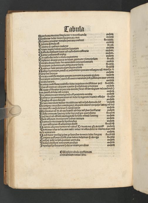 Sunt bona moꝛtua ſimpliciter? moꝛtificanda eodem Monfitens debet dicere ſua peccata met eodem In homo teneatur venialia peccata confiteri fo· cxxxix. Nuxuriaqᷓ; malaeſt 6 eodem uxuria ex quibus cauſatur fo· cx. Ocium diuitie delicie cauſant luxuriam eodem Guſiodia ſenſuum iuuat ad cuſtodiam caſtitatis eodem- Wn⸗ pollutioeſt triplex eodem⸗ Eoꝛ cuſtodiri debet a mala cogitatione Bet42 eodem Tnpliciter aliquis peccat in deum ꝓximum? ſemetipſum fo. cxli. Peccata aliqua fiunt ᷣm naturalem concupiſcentiam eodem — ʒodomiticum comparatur lepꝛe o xlij· Quattuoꝛ ſunt peccata clamãtia in celum ocxliij