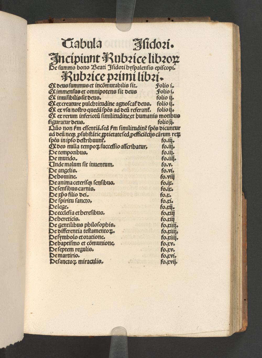 ſpẽs in ipſo deſtribuunt. fo.iij. Mdeo nulla tempoꝝ ſucceſſio aſſcribatur. fo.iij. De tempoꝛibus. fo.iij · De mundo. fo.iij. Unde malum ſit inuentum fo.v. De angelis. fo.vi. Dehomine. fo. viij De anima ceteriſq; ſenſibus. fo.ix. Deſenſibus carnis. fo.ix⸗ De xpo filio dei. fo.x. De ſpiritu ſancto. fo.xi⸗ Delege. fo.xij De eccleſia ethereſibus. fo·xiij Dehereticis. fo.xüij De gentilibus philoſe ophis⸗ foxiiij⸗ De differentia teſtamentoꝝ. fo.xiiij Deſymbolo etoꝛatione. fo. xiiij. Debaptiſmo et cõmunione. fo. xv. De ſeptem regulis⸗ fo.xvx. Demartirio. foxxi⸗ Deſanctoꝝ miraculis⸗ fo· xvij⸗