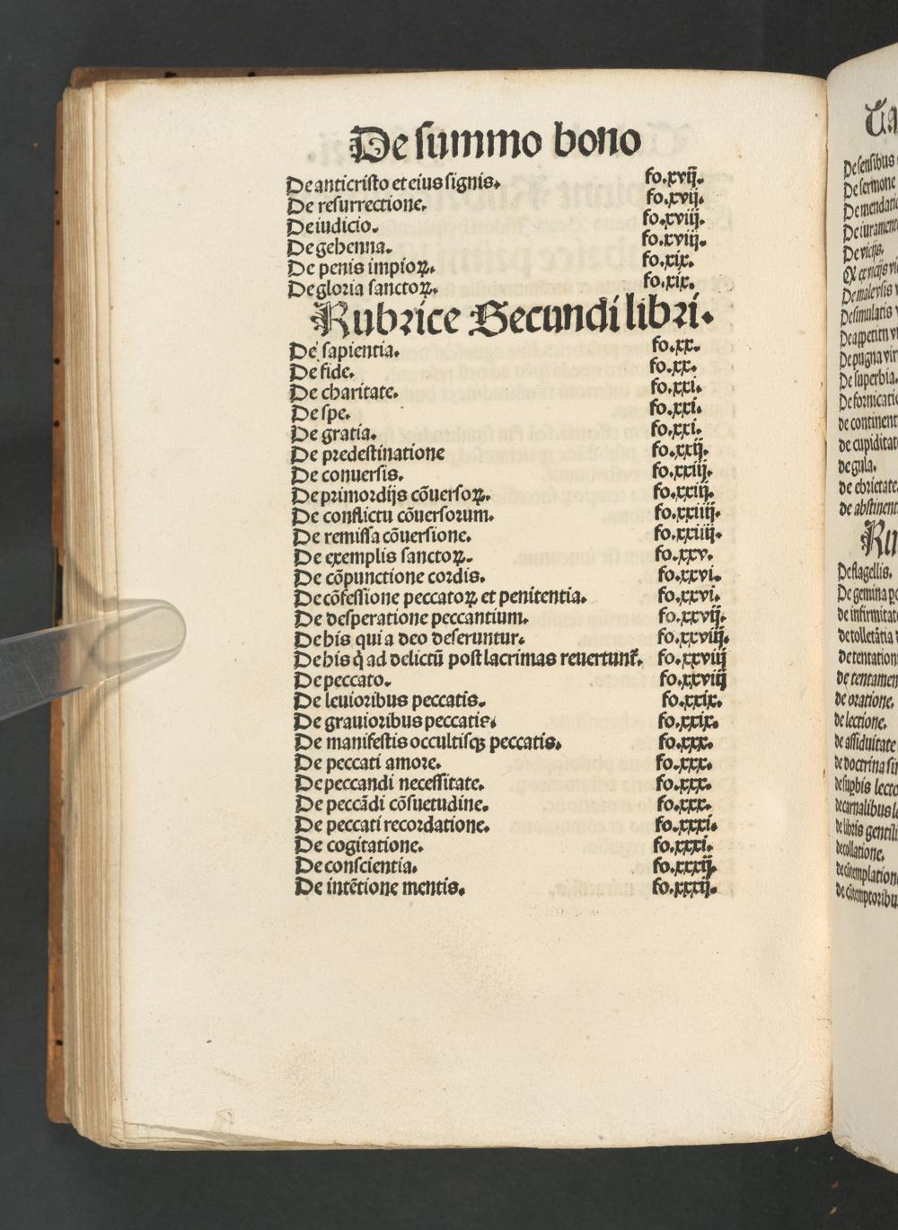 De anticriſto eteius ſignis De reſurrectione.— Deiudicio- tri Degehenna. o De—— Degloꝛia ſanc oꝝ⸗ * Bubꝛice Becundi lhĩi De ſapientia.— —— fo·xxi De charitate.— *— foxxi. De gratia.— De pꝛedeſtinatione Depꝛimoꝛdijs cõuerſoꝝ* üi De conflictu cõuerſoꝛum.— De remiſſa cõuerſione. ij. De exemplis ſanctoꝝ- De cõpunctione coꝛdis. o⸗xvi De cõfeſſione peccatoꝝ et penitentia. fo· cxvi⸗ De deſperatione peccantium. fo. xxvij⸗ Debis quia deo deſeruntur⸗ fo· xxviij⸗ Dehis qͥ ad delictũ poſtlacrimas reuertunt᷑. fo.xxvij De peccato. fo· xxviij De leuioꝛibus peccatis- fo. xxix. De grauioꝛibus peccatie. fo⸗xxix. De manifeſtis occultiſq; peccatis fo·xxx. De peccati amoꝛe. fo.xxx. Depeccandi neceſſitate. ſo.xxx. De peccãdi cõſuetudine. fo. xxx· De peccati recoꝛdatione. fo.xxxi⸗ De cogitatione. fo.xxxi⸗ De conſcientia oxxxij De intẽtione mentis. foxxxij⸗