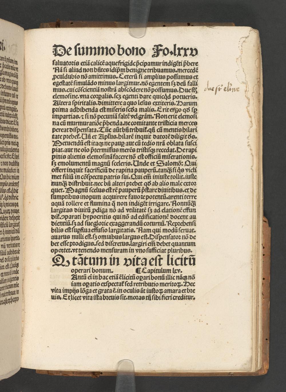 mus.cuicõſcientiã noſtrã abſcõdere nõ poſſumus Dueſtj elemoſine.vna coꝛꝑalis.ſcʒ egenti dare quicꝗd potueris. Altera ſpiritalis.dimittere aquo leſus extiteris. Harum pꝛima adhibenda eſt miſeris ſca malis. Erit ergo qð ſp impartias.⁊ ſi nõ pecuniã ſaltẽ velgrãm. Nonerit elemoſi na cũ murmuratiõe pᷣbenda.ne comitante triſticia merces pereat diſpenſata. Tũc aũtbñtribuit᷑.qñ cũ mentis hilari tate pꝛebet᷑. Uñ et Aplus.hilarẽ inquit datoꝛẽ diligit ðᷣs. Wetuendũ eſt itaq; ne pauꝑ aut cũ tedio nrã oblata ſuſci piat. aut ne oĩo pᷣtermiſſus merẽs triſtiſq; recedat. De rapi pinis alienis elemoſinã facere nõ eſt officiũ miſerationis. ſ emolumentũ magnũ ſceleris. Unde et Salomõ: Qui offert inquit ſacrificiũ de rapina pauperũ.tanqᷓ; ſi qͥs victi met filiũ in cõſpectu patris ſui. Qui ẽ iniuſte tollit.iuſte nunqᷓ; diſtribuit.nec bñ alteri pꝛebet qð̃ ab alio male extoꝛ