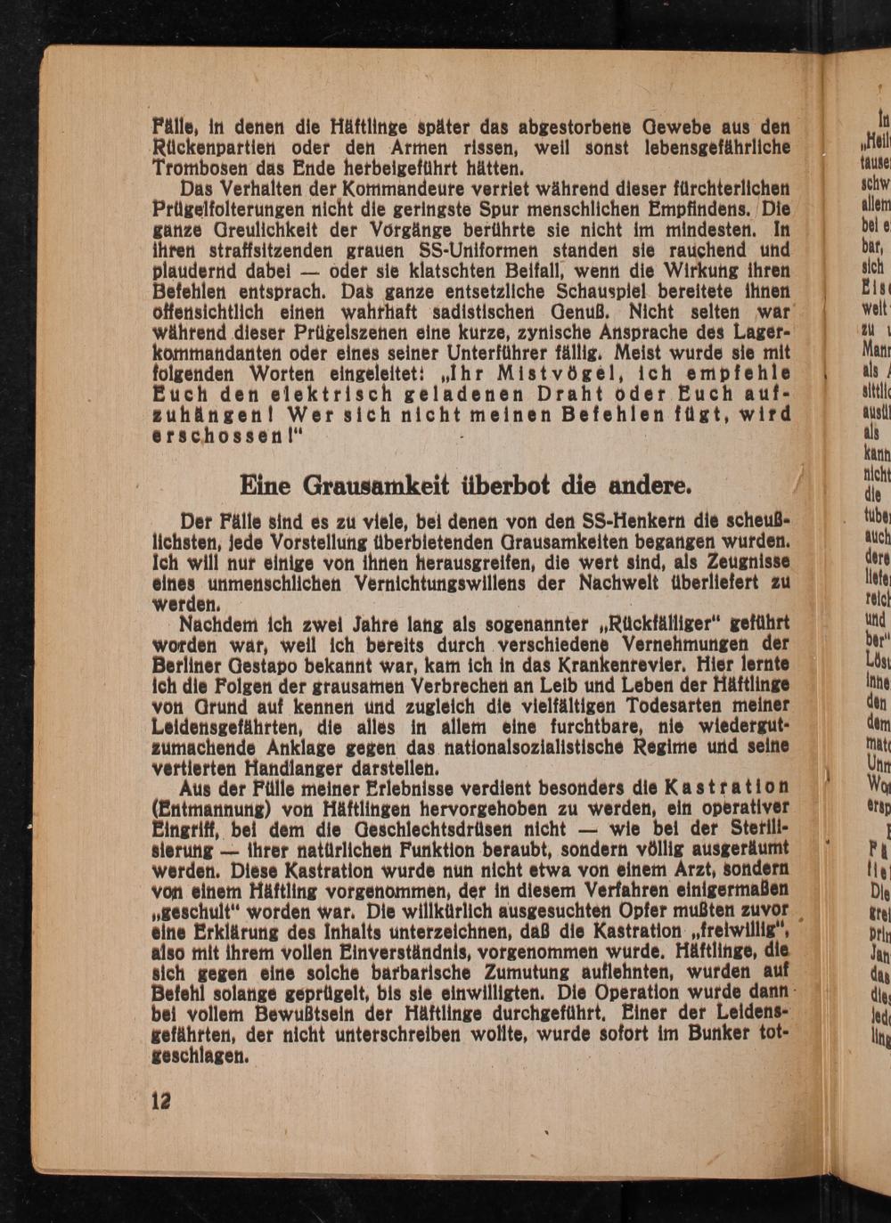 Aus der Fülle meiner Erlebnisse verdient besonders die Kastration ( Entmannung) von Häftlingen hervorgehoben zu werden, ein operativer Eingriff, bei dem die Geschlechtsdrüsen nicht- wie bei der Sterillsierung ihrer natürlichen Funktion beraubt, sondern völlig ausgeräumt werden. Diese Kastration wurde nun nicht etwa von einem Arzt, sondern von einem Häftling vorgenommen, der in diesem Verfahren einigermaßen geschult" worden war. Die willkürlich ausgesuchten Opfer mußten zuvor eine Erklärung des Inhalts unterzeichnen, daß die Kastration ,, freiwillig", also mit ihrem vollen Einverständnis, vorgenommen wurde. Häftlinge, die sich gegen eine solche barbarische Zumutung auflehnten, wurden auf Befehl solange geprügelt, bis sie einwilligten. Die Operation wurde dann bei vollem Bewußtsein der Häftlinge durchgeführt. Einer der Leidensgefährten, der nicht unterschreiben wollte, wurde sofort im Bunker totgeschlagen.