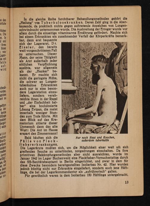 sich der Lagerarzt, Dr. Eiseler , den bereits weit vorgeschrittenen Fall zu untersuchen. Dieser Mann, der seine Tätigkeit als Arzt außerhalb jeder sittlichen Verpflichtung ausübte, war allgemein als der Henker" be­kannt. Er machte sich nicht die geringste Mühe, die schwer an Lungen­tuberkulose Erkrankten auch nur in eine beson­dere Lagerstation einzu­liefern, sondern verab­reichte ihnen in der Regel und ,, der Einfachheit hal­ber" eine hochdosierte Lösung Evipan, die meist innerhalb weniger Stun­den zum Tode führte. Mit dem Blick auf das Kre­matorium zitierte dieser Unmensch dann das alte Wort: Die Axt im Hause erspart den Zimmermann!