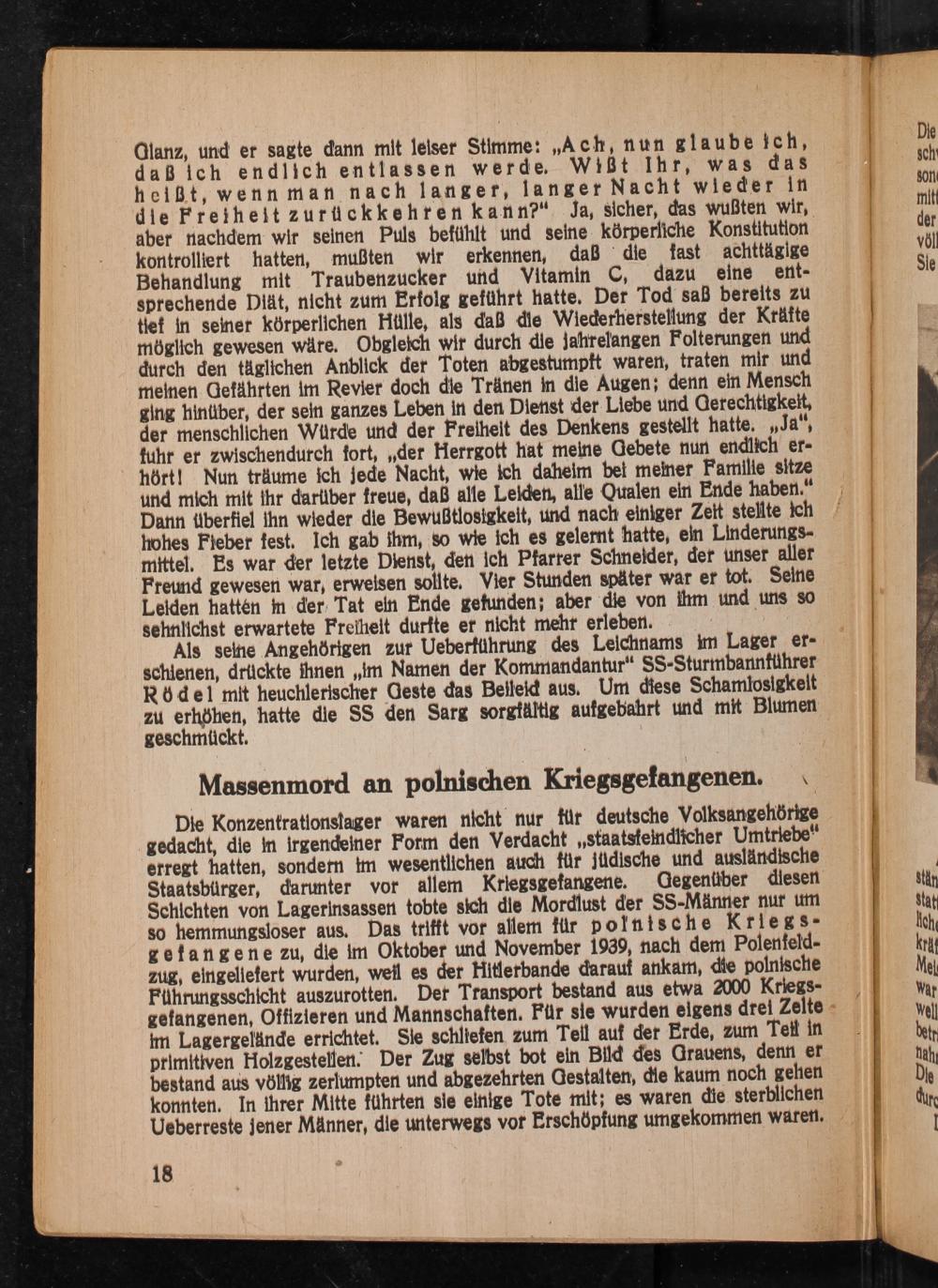 Glanz, und er sagte dann mit leiser Stimme: ,, Ach, nun glaube ich, daß ich endlich entlassen werde. Wiẞt Ihr, was das heißt, wenn man nach langer, langer Nacht wieder in die Freiheit zurückkehren kann?" Ja, sicher, das wußten wir, aber nachdem wir seinen Puls befühlt und seine körperliche Konstitution kontrolliert hatten, mußten wir erkennen, daß die fast achttägige Behandlung mit Traubenzucker und Vitamin C, dazu eine entsprechende Diät, nicht zum Erfolg geführt hatte. Der Tod saß bereits zu tief in seiner körperlichen Hülle, als daß die Wiederherstellung der Kräfte möglich gewesen wäre. Obgleich wir durch die jahrelangen Folterungen und durch den täglichen Anblick der Toten abgestumpft waren, traten mir und meinen Gefährten im Revier doch die Tränen in die Augen; denn ein Mensch ging hinüber, der sein ganzes Leben in den Dienst der Liebe und Gerechtigkeit, der menschlichen Würde und der Freiheit des Denkens gestellt hatte." Ja", fuhr er zwischendurch fort ,,, der Herrgott hat meine Gebete nun endlich erhört! Nun träume ich jede Nacht, wie ich daheim bei meiner Familie sitze und mich mit ihr darüber freue, daß alle Leiden, all'e Qualen ein Ende haben." Dann überfiel ihn wieder die Bewußtlosigkeit, und nach einiger Zeit stellte ich hohes Fieber fest. Ich gab ihm, so wie ich es gelernt hatte, ein Linderungsmittel. Es war der letzte Dienst, den ich Pfarrer Schneider , der unser aller Freund gewesen war, erweisen sollte. Vier Stunden später war er tot. Seine Leiden hattén in der Tat ein Ende gefunden; aber die von ihm und uns so sehnlichst erwartete Freiheit durfte er nicht mehr erleben.