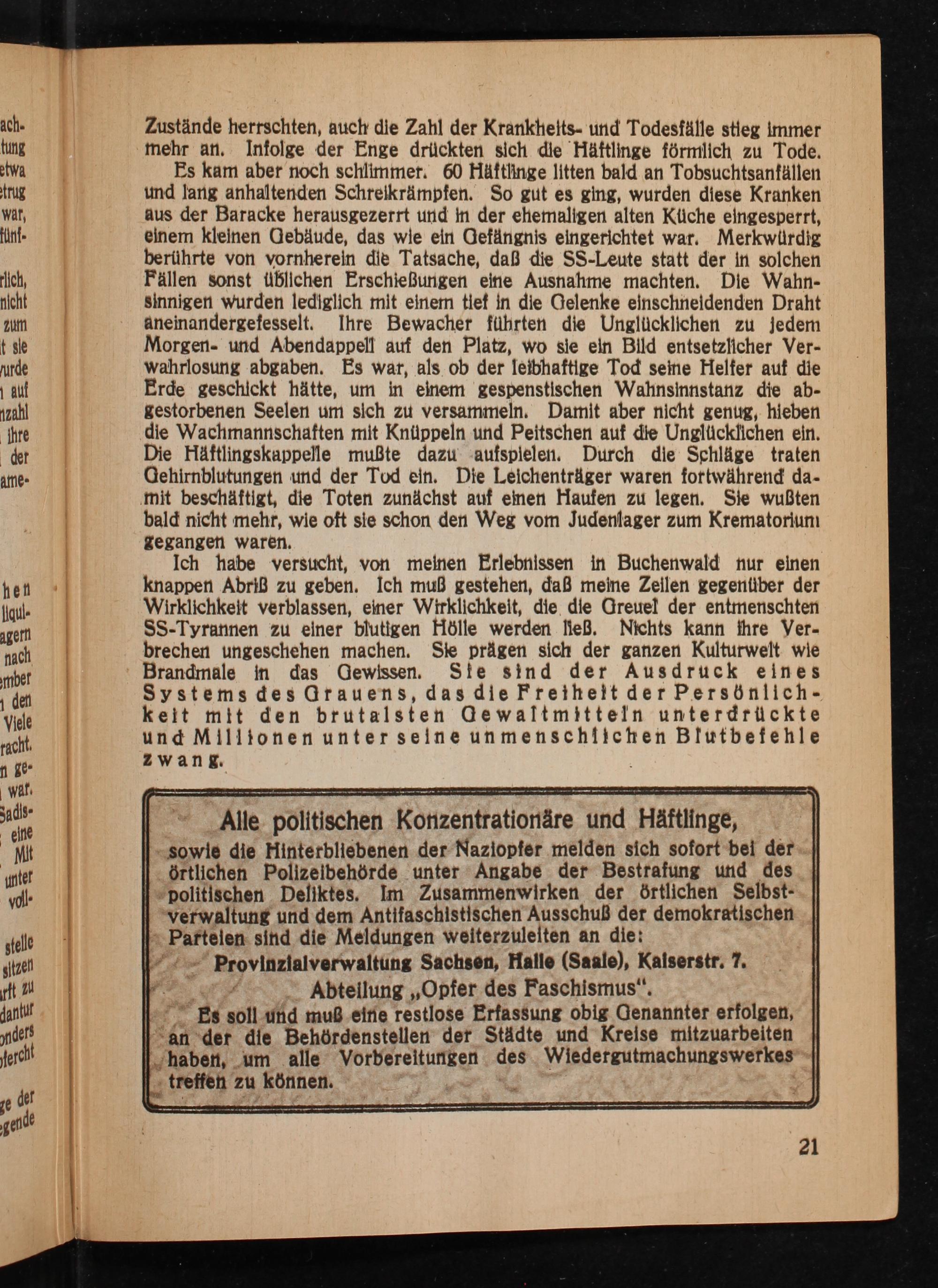 Ich habe versucht, von meinen Erlebnissen in Buchenwald nur einen knappen Abriß zu geben. Ich muß gestehen, daß meine Zeilen gegenüber der Wirklichkeit verblassen, einer Wirklichkeit, die die Greuel der entmenschten SS - Tyrannen zu einer blutigen Hölle werden ließ. Nichts kann Ihre Verbrechen ungeschehen machen. Sie prägen sich der ganzen Kulturwelt wie Brandmale in das Gewissen. Sie sind der Ausdruck eines Systems des Grauens, das die Freiheit der Persönlichkeit mit den brutalsten Gewaltmitteln unterdrückte und Millionen unter seine unmenschlichen Blutbefehle zwang.