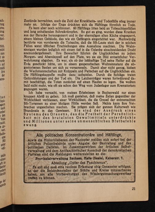 sowie die Hinterbliebenen der Naziopfer melden sich sofort bei der örtlichen Polizeibehörde unter Angabe der Bestrafung und des politischen Deliktes. Im Zusammenwirken der örtlichen Selbstverwaltung und dem Antifaschistischen Ausschuß der demokratischen Parteien sind die Meldungen weiterzuleiten an die: