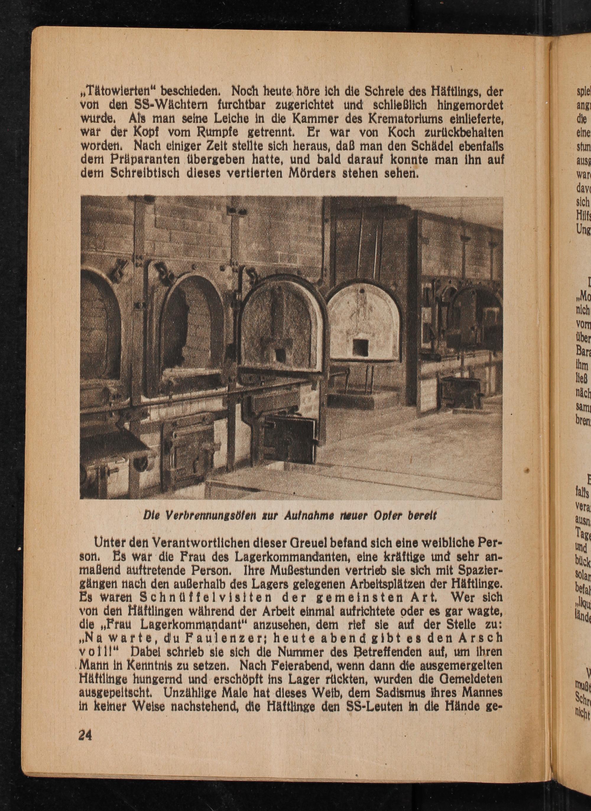 Tätowierten" beschieden. Noch heute höre ich die Schreie des Häftlings, der von den SS- Wächtern furchtbar zugerichtet und schließlich hingemordet wurde. Als man seine Leiche in die Kammer des Krematoriums einlieferte, war der Kopf vom Rumpfe getrennt. Er war von Koch zurückbehalten worden. Nach einiger Zeit stellte sich heraus, daß man den Schädel ebenfalls dem Präparanten übergeben hatte, und bald darauf konnte man ihn auf dem Schreibtisch dieses vertierten Mörders stehen sehen.