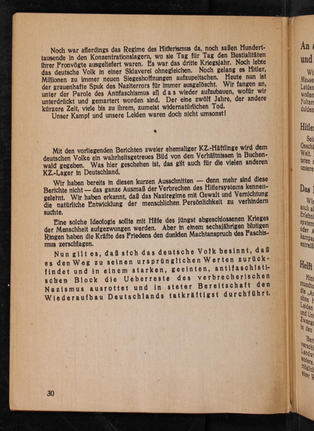 Nun gilt es, daß sich das deutsche Volk besinnt, daß es den Weg zu seinen ursprünglichen Werten zurückfindet und in einem starken, geeinten, antifaschistischen Block die Ueberreste des verbrecherischen Nazismus ausrottet und in steter Bereitschaft den Wiederaufbau Deutschlands tatkräftigst durchführt.