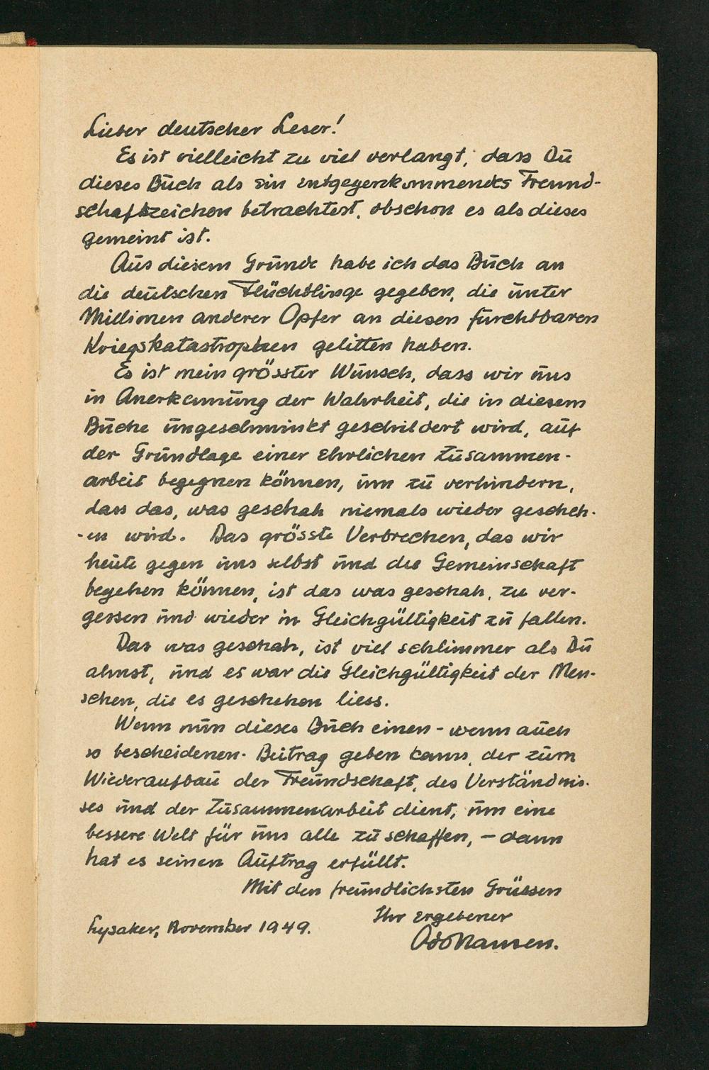 Es ist mein grösster Wünsch, dass wir nus in Anerkamung der Wahrheit, die in diesem Buche ingeselinkt gesebildert wird, aut der Grundlage einer Ehrlichen Zusammen. arbeit begegnen können, inn zu verhindern, dass das, was geschah niemals wieder gescheh. en wird. Das grösste Verbrechen, das wir heute gegen ins selbst und die Gemeinschaft begehen können, ist das was geschah, zu vergessen und wieder in Heichgültigkeit zu fallen.