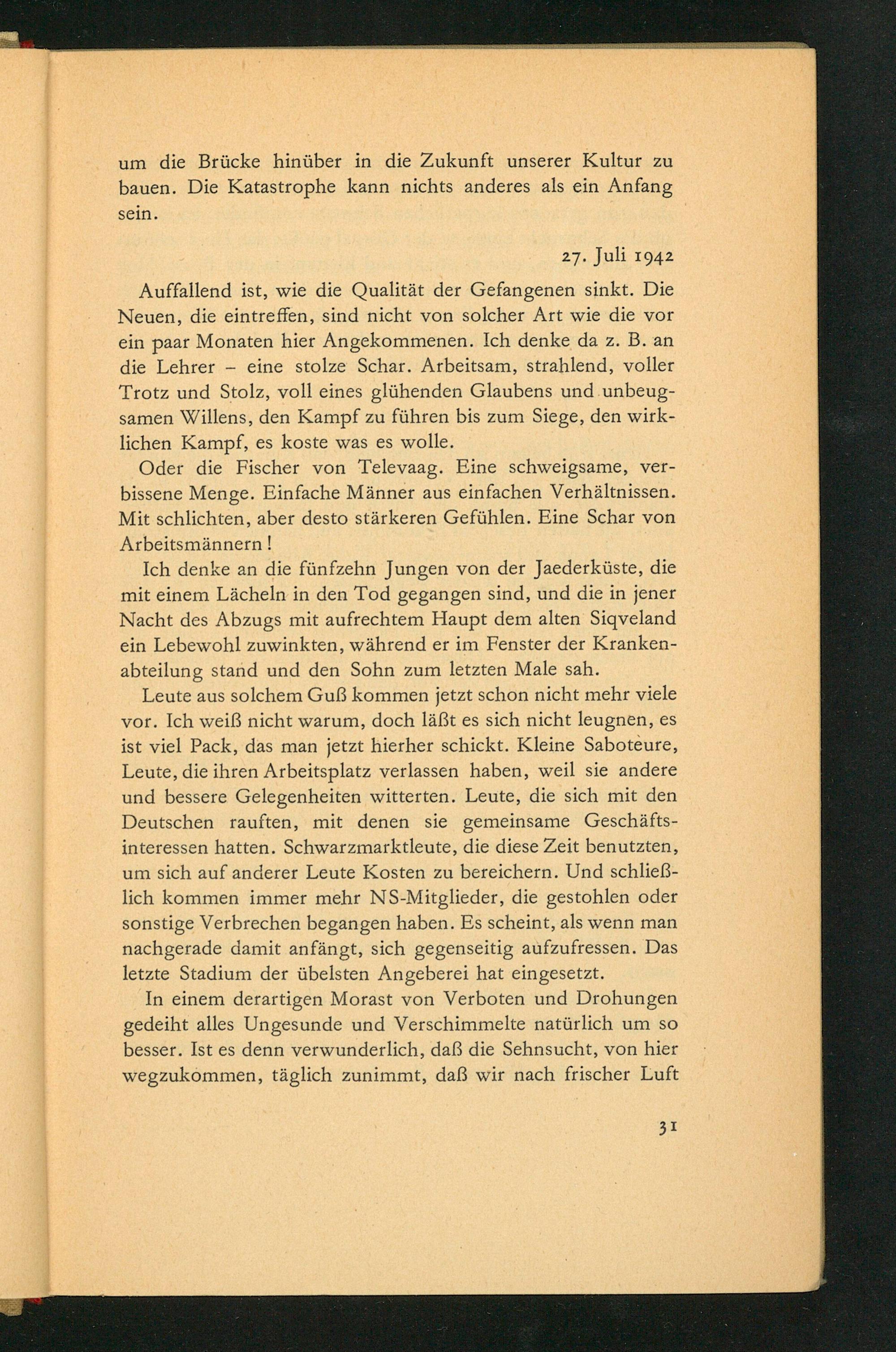 Auffallend ist, wie die Qualität der Gefangenen sinkt. Die Neuen, die eintreffen, sind nicht von solcher Art wie die vor ein paar Monaten hier Angekommenen. Ich denke da z. B. an die Lehrer eine stolze Schar. Arbeitsam, strahlend, voller Trotz und Stolz, voll eines glühenden Glaubens und unbeugsamen Willens, den Kampf zu führen bis zum Siege, den wirklichen Kampf, es koste was es wolle.
