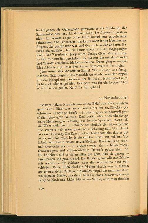 Gestern bekam ich nicht nur einen Brief von Kari, sondern ganze zwei. Einer war am 24. und einer am 30. Oktober ge- schrieben. Prächtige Briefe- in einem ganz wundervoll per- sönlich geprägten Deutsch . Kari besitzt aber auch überhaupt keine Hemmungen in bezug auf fremde Sprachen. Wenn sie ein Wort nicht kennt, schreibt sie einfach das Norwegische und stattet es mit etwas deutschem Schwung aus. Und damit ist es in Ordnung. Die Zensur ist auch der Ansicht, daß es gut ist so, und für mich ist ja ein solcher Brief mit solchen Vo- kabeln und einem derart unverfälschten Kari-Gepräge zehn- mal wertvoller als es ein anderer wäre, der in fehlerfreiem, fremdartigem und unpersönlichem Deutsch geschrieben ist. Sie berichtet, daß es ihnen allen gut geht, daß sie genug zu essen haben und gesund sind. Die Kinder gehen alle zur Schule mit Ausnahme des Kleinen, aber die Schulzeiten sind ver- schieden. Beide Briefe sind ein frischer Hauch von zu Hause, aus einer anderen Welt, und plötzlich empfindet man mit über- wältigender Stärke, was diese Welt für einen bedeutet, was sie birgt an Kraft und Licht. Mit einem Schlag wird man dorthin