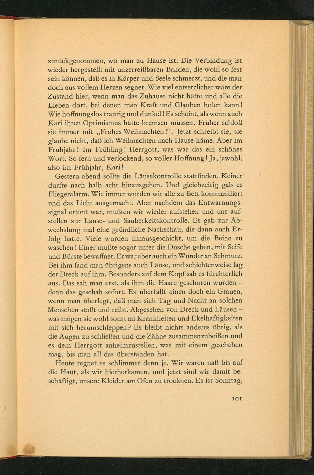 zurückgenommen, wo man zu Hause ist. Die Verbindung ist wieder hergestellt mit unzerreißbaren Banden, die wohl so fest sein können, daß es in Körper und Seele schmerzt, und die man doch aus vollem Herzen segnet. Wie viel entsetzlicher wäre der Zustand hier, wenn man das Zuhause nicht hätte und alle die Lieben dort, bei denen man Kraft und Glauben holen kann! Wie hoffnungslos traurig und dunkel! Es scheint, als wenn auch Kari ihren Optimismus hätte bremsen müssen. Früher schloß sie immer mit ,, Frohes Weihnachten!". Jetzt schreibt sie, sie glaube nicht, daß ich Weihnachten nach Hause käme. Aber im Frühjahr! Im Frühling! Herrgott, was war das ein schönes Wort. So fern und verlockend, so voller Hoffnung! Ja, jawohl, also im Frühjahr, Kari!