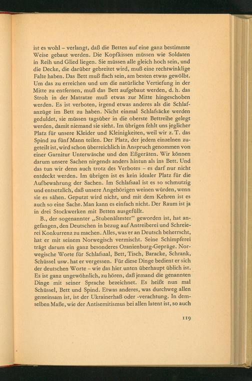 B., der sogenannter ,, Stuben ältester" geworden ist, hat angefangen, den Deutschen in bezug auf Antreiberei und Schreierei Konkurrenz zu machen. Alles, was er an Deutsch beherrscht, hat er mit seinem Norwegisch vermischt. Seine Schimpferei trägt darum ein ganz besonderes Oranienburg - Gepräge. Norwegische Worte für Schlafsaal, Bett, Tisch, Baracke, Schrank, Schüssel usw. hat er vergessen. Für diese Dinge bedient er sich der deutschen Worte- wie das hier unten überhaupt üblich ist. Es ist ganz ungewöhnlich, zu hören, daß jemand die genannten Dinge mit seiner Sprache bezeichnet. Es heißt nun mal Schüssel, Bett und Spind. Etwas anderes, was durchweg allen gemeinsam ist, ist der Ukrainerhaß oder-verachtung. In demselben Maße, wie der Antisemitismus bei allen latent ist, so auch