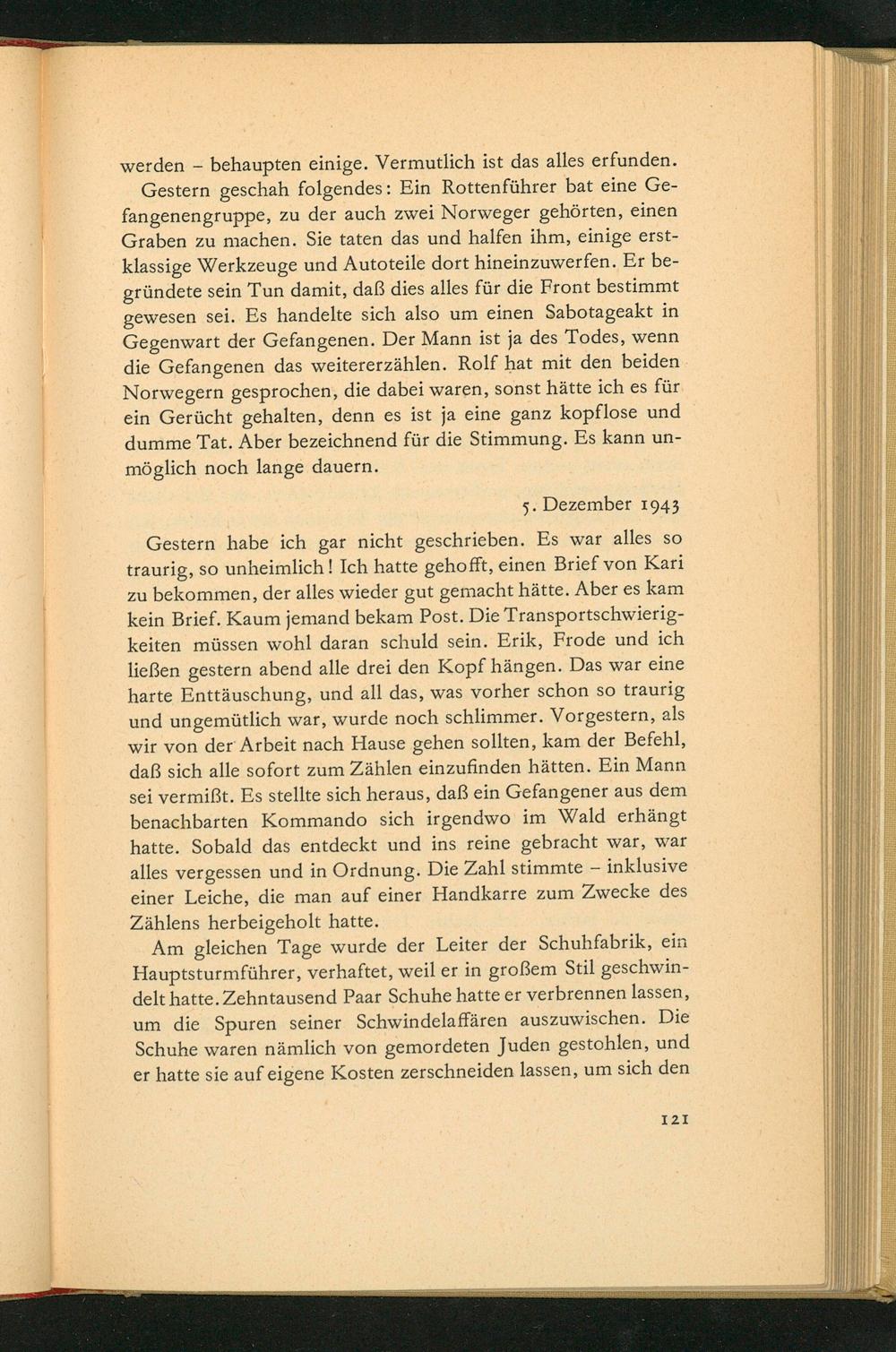 Gestern habe ich gar nicht geschrieben. Es war alles so traurig, so unheimlich! Ich hatte gehofft, einen Brief von Kari zu bekommen, der alles wieder gut gemacht hätte. Aber es kam kein Brief. Kaum jemand bekam Post. Die Transportschwierigkeiten müssen wohl daran schuld sein. Erik, Frode und ich ließen gestern abend alle drei den Kopf hängen. Das war eine harte Enttäuschung, und all das, was vorher schon so traurig und ungemütlich war, wurde noch schlimmer. Vorgestern, als wir von der Arbeit nach Hause gehen sollten, kam der Befehl, daß sich alle sofort zum Zählen einzufinden hätten. Ein Mann sei vermiẞt. Es stellte sich heraus, daß ein Gefangener aus dem benachbarten Kommando sich irgendwo im Wald erhängt hatte. Sobald das entdeckt und ins reine gebracht war, war alles vergessen und in Ordnung. Die Zahl stimmte- inklusive einer Leiche, die man auf einer Handkarre zum Zwecke des Zählens herbeigeholt hatte.