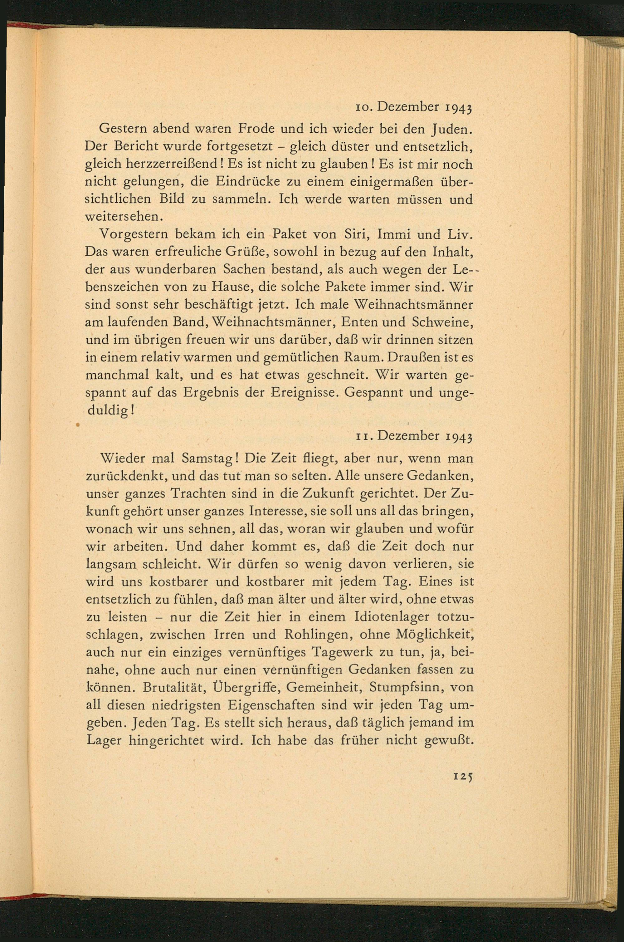Wieder mal Samstag! Die Zeit fliegt, aber nur, wenn man zurückdenkt, und das tut man so selten. Alle unsere Gedanken, unser ganzes Trachten sind in die Zukunft gerichtet. Der Zu- kunft gehört unser ganzes Interesse, sie soll uns all das bringen, wonach wir uns sehnen, all das, woran wir glauben und wofür wir arbeiten. Und daher kommt es, daß die Zeit doch nur langsam schleicht. Wir dürfen so wenig davon verlieren, sie wird uns kostbarer und kostbarer mit jedem Tag. Eines ist entsetzlich zu fühlen, daß man älter und älter wird, ohne etwas zu leisten- nur die Zeit hier in einem Idiotenlager totzu- schlagen, zwischen Irren und Rohlingen, ohne Möglichkeit, auch nur ein einziges vernünftiges Tagewerk zu tun, ja, bei- nahe, ohne auch nur einen vernünftigen Gedanken fassen zu können. Brutalität, Übergriffe, Gemeinheit, Stumpfsinn, von all diesen niedrigsten Eigenschaften sind wir jeden Tag um- geben. Jeden Tag. Es stellt sich heraus, daß täglich jemand im Lager hingerichtet wird. Ich habe das früher nicht gewußt.