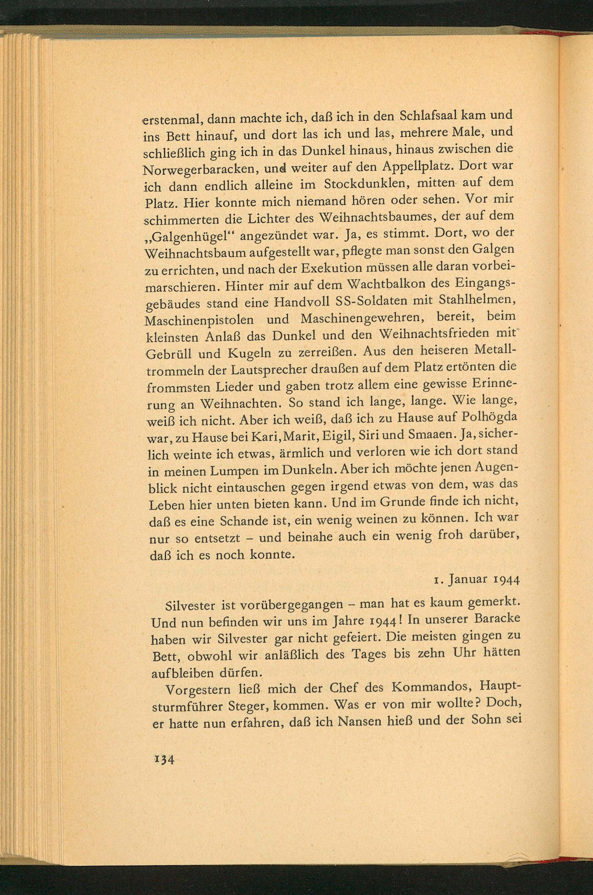 erstenmal, dann machte ich, daß ich in den Schlafsaal kam und ins Bett hinauf, und dort las ich und las, mehrere Male, und schließlich ging ich in das Dunkel hinaus, hinaus zwischen die Norwegerbaracken, und weiter auf den Appellplatz. Dort war ich dann endlich alleine im Stockdunklen, mitten. auf dem Platz. Hier konnte mich niemand hören oder sehen. Vor mir schimmerten die Lichter des Weihnachtsbaumes, der auf dem „Galgenhügel“ angezündet war. Ja, es stimmt. Dort, wo der Weihnachtsbaum aufgestellt war, pflegte man sonst den Galgen zu errichten, und nach der Exekution müssen alle daran vorbei- marschieren. Hinter mir auf dem Wachtbalkon des Eingangs- gebäudes stand eine Handvoll SS-Soldaten mit Stahlhelmen, Maschinenpistolen und Maschinengewehren, bereit, beim kleinsten Anlaß das Dunkel und den Weihnachtsfrieden mit Gebrüll und Kugeln zu zerreißen. Aus den heiseren Metall- trommeln der Lautsprecher draußen auf dem Platz ertönten die frommsten Lieder und gaben trotz allem eine gewisse Erinne- rung an Weihnachten . So stand ich lange, lange. Wie lange, weiß ich nicht. Aber ich weiß, daß ich zu Hause auf Polhögda war, zu Hause bei Kari,Marit, Bigil, Siri und Smaaen. Ja, sicher- lich weinte ich etwas, ärmlich und verloren wie ich dort stand in meinen Lumpen im Dunkeln. Aber ich möchte jenen Augen- blick nicht eintauschen gegen irgend etwas von dem, was das Leben hier unten bieten kann. Und im Grunde finde ich nicht, daß es eine Schande ist, ein wenig weinen zu können. Ich war nur so entsetzt- und beinahe auch ein wenig froh darüber, daß ich es noch konnte.