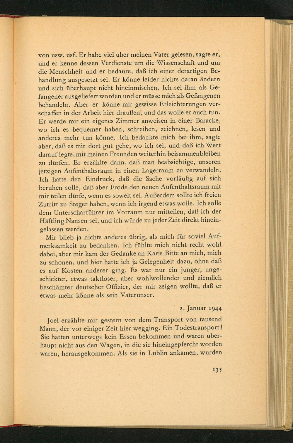 von usw. usf. Er habe viel über meinen Vater gelesen, sagte er, und er kenne dessen Verdienste um die Wissenschaft und um die Menschheit und er bedaure, daß ich einer derartigen Behandlung ausgesetzt sei. Er könne leider nichts daran ändern und sich überhaupt nicht hineinmischen. Ich sei ihm als Gefangener ausgeliefert worden und er müsse mich als Gefangenen behandeln. Aber er könne mir gewisse Erleichterungen verschaffen in der Arbeit hier draußen, und das wolle er auch tun. Er werde mir ein eigenes Zimmer anweisen in einer Baracke, wo ich es bequemer haben, schreiben, zeichnen, lesen und anderes mehr tun könne. Ich bedankte mich bei ihm, sagte aber, daß es mir dort gut gehe, wo ich sei, und daß ich Wert darauf legte, mit meinen Freunden weiterhin beisammenbleiben zu dürfen. Er erzählte dann, daß man beabsichtige, unseren jetzigen Aufenthaltsraum in einen Lagerraum zu verwandeln. Ich hatte den Eindruck, daß die Sache vorläufig auf sich beruhen solle, daß aber Frode den neuen Aufenthaltsraum mit mir teilen dürfe, wenn es soweit sei. Außerdem sollte ich freien Zutritt zu Steger haben, wenn ich irgend etwas wolle. Ich solle dem Unterscharführer im Vorraum nur mitteilen, daß ich der Häftling Nansen sei, und ich würde zu jeder Zeit direkt hineingelassen werden.