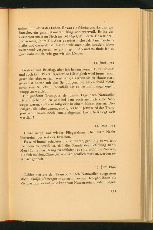 Ein größerer Transport, der dieser Tage nach Natzweiler hätte abgehen sollen und bei dem auch ziemlich viele Nor- weger waren, soll vorläufig erst in einem Monat starten. Die- jenigen, die dabei waren, sind glücklich. Jetzt wird der Trans- port wohl kaum noch jemals abgehen. Das Elsaß liegt weit westlich!