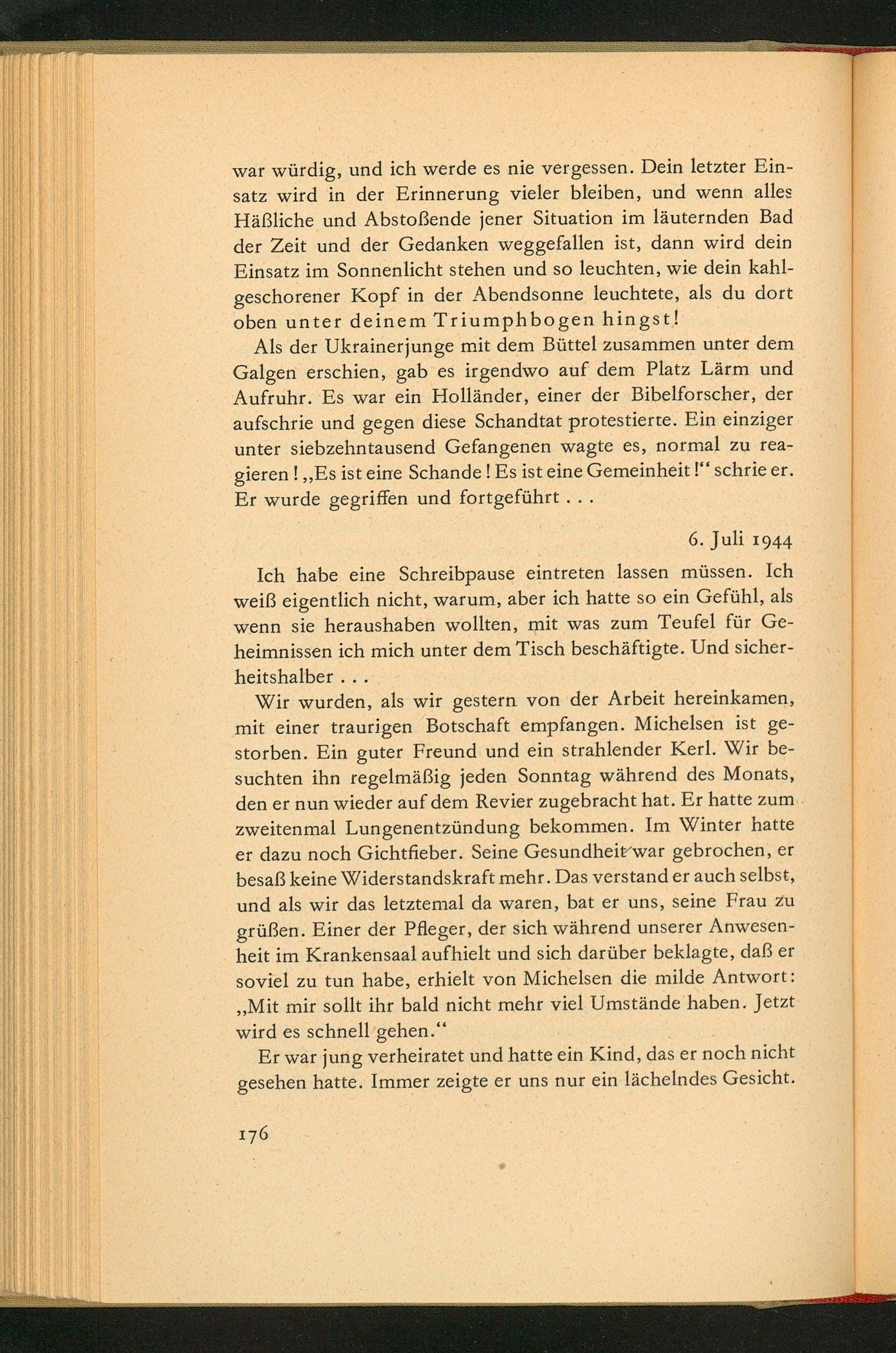 Als der Ukrainerjunge mit dem Büttel zusammen unter dem Galgen erschien, gab es irgendwo auf dem Platz Lärm und Aufruhr. Es war ein Holländer, einer der Bibelforscher, der aufschrie und gegen diese Schandtat protestierte. Ein einziger unter siebzehntausend Gefangenen wagte es, normal zu reagieren! ,, Es ist eine Schande! Es ist eine Gemeinheit!" schrie er. Er wurde gegriffen und fortgeführt...