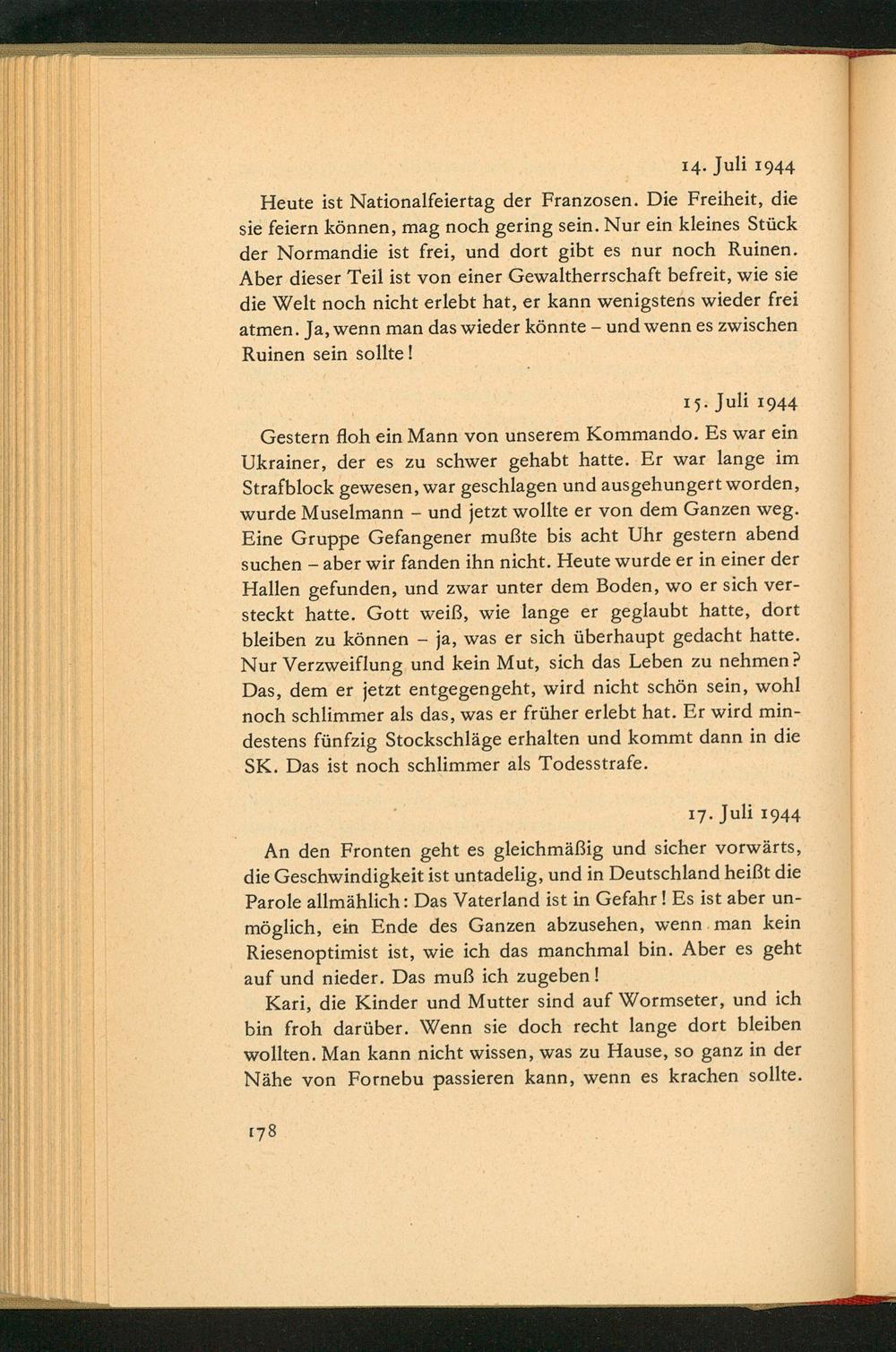 Heute ist Nationalfeiertag der Franzosen . Die Freiheit, die sie feiern können, mag noch gering sein. Nur ein kleines Stück der Normandie ist frei, und dort gibt es nur noch Ruinen. Aber dieser Teil ist von einer Gewaltherrschaft befreit, wie sie die Welt noch nicht erlebt hat, er kann wenigstens wieder frei atmen. Ja, wenn man das wieder könnte- und wenn es zwischen Ruinen sein sollte!
