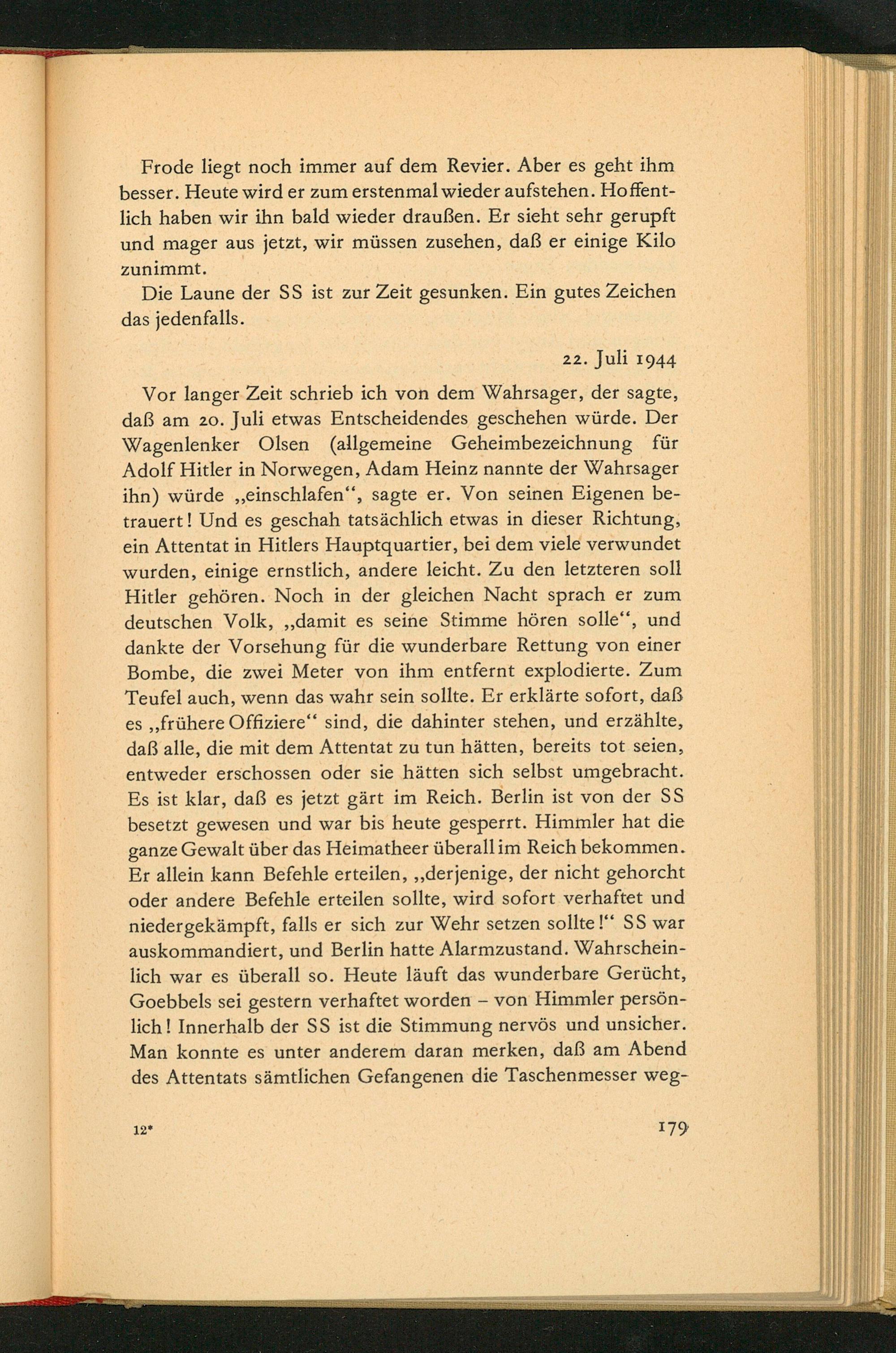 Vor langer Zeit schrieb ich von dem Wahrsager, der sagte, daß am 20. Juli etwas Entscheidendes geschehen würde. Der Wagenlenker Olsen( allgemeine Geheimbezeichnung für Adolf Hitler in Norwegen , Adam Heinz nannte der Wahrsager ihn) würde ,, einschlafen", sagte er. Von seinen Eigenen betrauert! Und es geschah tatsächlich etwas in dieser Richtung, ein Attentat in Hitlers Hauptquartier, bei dem viele verwundet wurden, einige ernstlich, andere leicht. Zu den letzteren soll Hitler gehören. Noch in der gleichen Nacht sprach er zum deutschen Volk ,,, damit es seine Stimme hören solle", und dankte der Vorsehung für die wunderbare Rettung von einer Bombe, die zwei Meter von ihm entfernt explodierte. Zum Teufel auch, wenn das wahr sein sollte. Er erklärte sofort, daß es ,, frühere Offiziere" sind, die dahinter stehen, und erzählte, daß alle, die mit dem Attentat zu tun hätten, bereits tot seien, entweder erschossen oder sie hätten sich selbst umgebracht. Es ist klar, daß es jetzt gärt im Reich. Berlin ist von der SS besetzt gewesen und war bis heute gesperrt. Himmler hat die ganze Gewalt über das Heimatheer überall im Reich bekommen. Er allein kann Befehle erteilen ,,, derjenige, der nicht gehorcht oder andere Befehle erteilen sollte, wird sofort verhaftet und niedergekämpft, falls er sich zur Wehr setzen sollte!" SS war auskommandiert, und Berlin hatte Alarmzustand. Wahrscheinlich war es überall so. Heute läuft das wunderbare Gerücht, Goebbels sei gestern verhaftet worden von Himmler persönlich! Innerhalb der SS ist die Stimmung nervös und unsicher. Man konnte es unter anderem daran merken, daß am Abend des Attentats sämtlichen Gefangenen die Taschenmesser weg