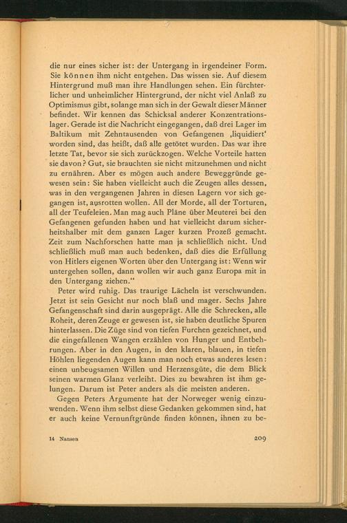 Peter wird ruhig. Das traurige Lächeln ist verschwunden. Jetzt ist sein Gesicht nur noch blaß und mager. Sechs Jahre Gefangenschaft sind darin ausgeprägt. Alle die Schrecken, alle Roheit, deren Zeuge er gewesen ist, sie haben deutliche Spuren hinterlassen. Die Züge sind von tiefen Furchen gezeichnet, und die eingefallenen Wangen erzählen von Hunger und Entbehrungen. Aber in den Augen, in den klaren, blauen, in tiefen Höhlen liegenden Augen kann man noch etwas anderes lesen: einen unbeugsamen Willen und Herzensgüte, die dem Blick seinen warmen Glanz verleiht. Dies zu bewahren ist ihm gelungen. Darum ist Peter anders als die meisten anderen.