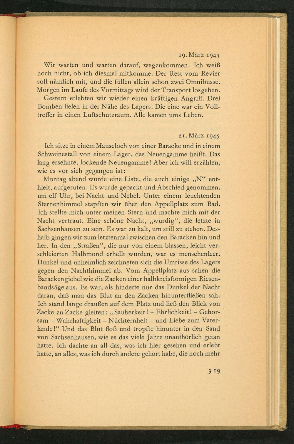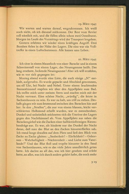 Montag abend wurde eine Liste, die auch einige ,, N" enthielt, aufgerufen. Es wurde gepackt und Abschied genommen, um elf Uhr, bei Nacht und Nebel. Unter einem leuchtenden Sternenhimmel stapften wir über den Appellplatz zum Bad. Ich stellte mich unter meinen Stern und machte mich mit der Nacht vertraut. Eine schöne Nacht ,,, würdig", die letzte in Sachsenhausen zu sein. Es war zu kalt, um still zu stehen. Deshalb gingen wir zum letztenmal zwischen den Baracken hin und her. In den ,, Straßen", die nur von einem blassen, leicht verschleierten Halbmond erhellt wurden, war es menschenleer. Dunkel und unheimlich zeichneten sich die Umrisse des Lagers gegen den Nachthimmel ab. Vom Appellplatz aus sahen die Barackengiebel wie die Zacken einer halbkreisförmigen Riesenbandsäge aus. Es war, als hinderte nur das Dunkel der Nacht daran, daß man das Blut an den Zacken hinunterfließen sah. Ich stand lange draußen auf dem Platz und ließ den Blick von Zacke zu Zacke gleiten: ,, Sauberkeit!- Ehrlichkeit!- Gehorsam Wahrhaftigkeit- Nüchternheit und Liebe zum Vaterlande!" Und das Blut floß und tropfte hinunter in den Sand von Sachsenhausen, wie es das viele Jahre unaufhörlich getan hatte. Ich dachte an all das, was ich hier gesehen und erlebt hatte, an alles, was ich durch andere gehört habe, die noch mehr