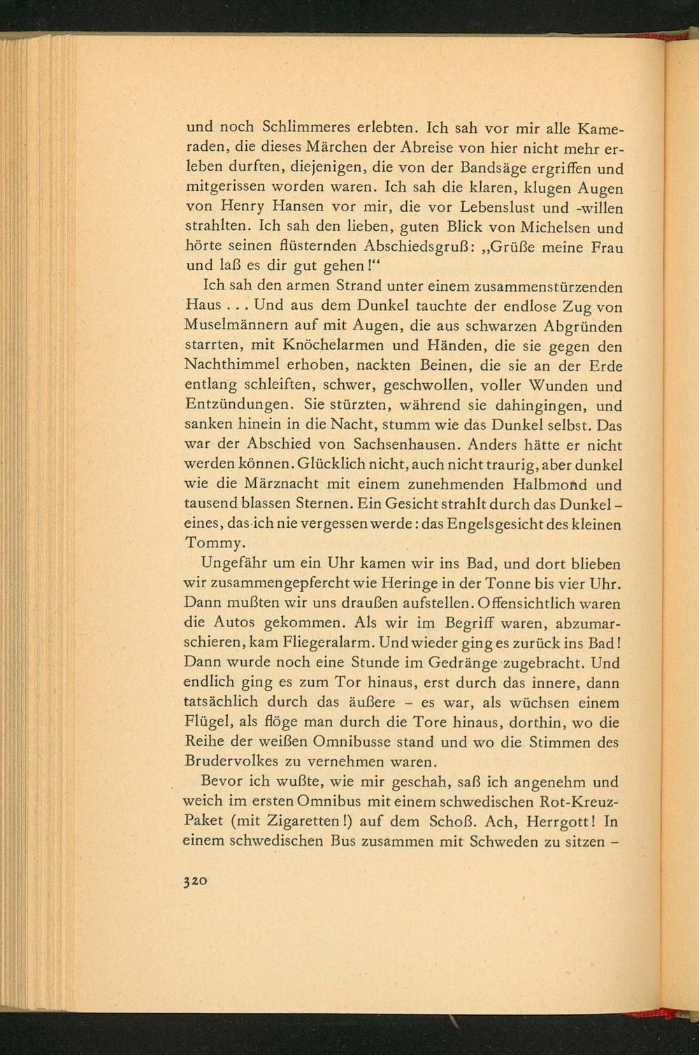 Ich sah den armen Strand unter einem zusammenstürzenden Haus... Und aus dem Dunkel tauchte der endlose Zug von Muselmännern auf mit Augen, die aus schwarzen Abgründen starrten, mit Knöchelarmen und Händen, die sie gegen den Nachthimmel erhoben, nackten Beinen, die sie an der Erde. entlang schleiften, schwer, geschwollen, voller Wunden und Entzündungen. Sie stürzten, während sie dahingingen, und sanken hinein in die Nacht, stumm wie das Dunkel selbst. Das war der Abschied von Sachsenhausen. Anders hätte er nicht werden können. Glücklich nicht, auch nicht traurig, aber dunkel wie die Märznacht mit einem zunehmenden Halbmond und tausend blassen Sternen. Ein Gesicht strahlt durch das Dunkel- eines, das ich nie vergessen werde: das Engelsgesicht des kleinen Tommy.