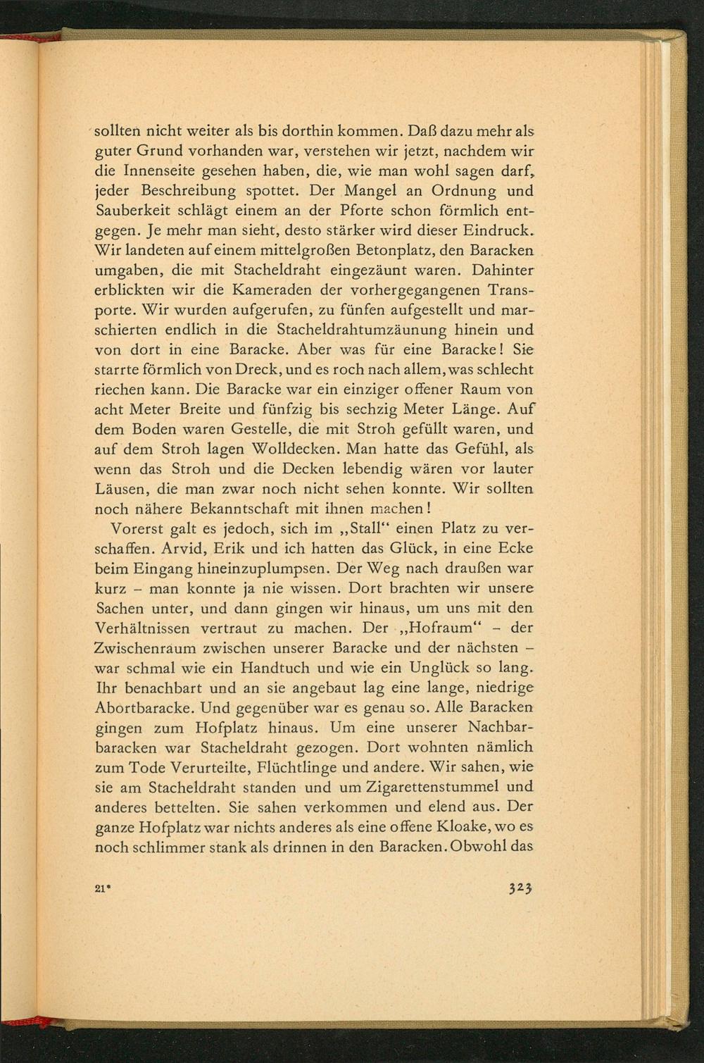 Vorerst galt es jedoch, sich im„ ,, Stall" einen Platz zu verschaffen. Arvid, Erik und ich hatten das Glück, in eine Ecke beim Eingang hineinzuplumpsen. Der Weg nach draußen war kurz man konnte ja nie wissen. Dort brachten wir unsere Sachen unter, und dann gingen wir hinaus, um uns mit den Verhältnissen vertraut zu machen. Der ,, Hofraum"- der Zwischenraum zwischen unserer Baracke und der nächsten war schmal wie ein Handtuch und wie ein Unglück so lang. Ihr benachbart und an sie angebaut lag eine lange, niedrige Abortbaracke. Und gegenüber war es genau so. Alle Baracken gingen zum Hofplatz hinaus. Um eine unserer Nachbarbaracken war Stacheldraht gezogen. Dort wohnten nämlich zum Tode Verurteilte, Flüchtlinge und andere. Wir sahen, wie sie am Stacheldraht standen und um Zigarettenstummel und anderes bettelten. Sie sahen verkommen und elend aus. Der ganze Hofplatz war nichts anderes als eine offene Kloake, wo es noch schlimmer stank als drinnen in den Baracken. Obwohl das