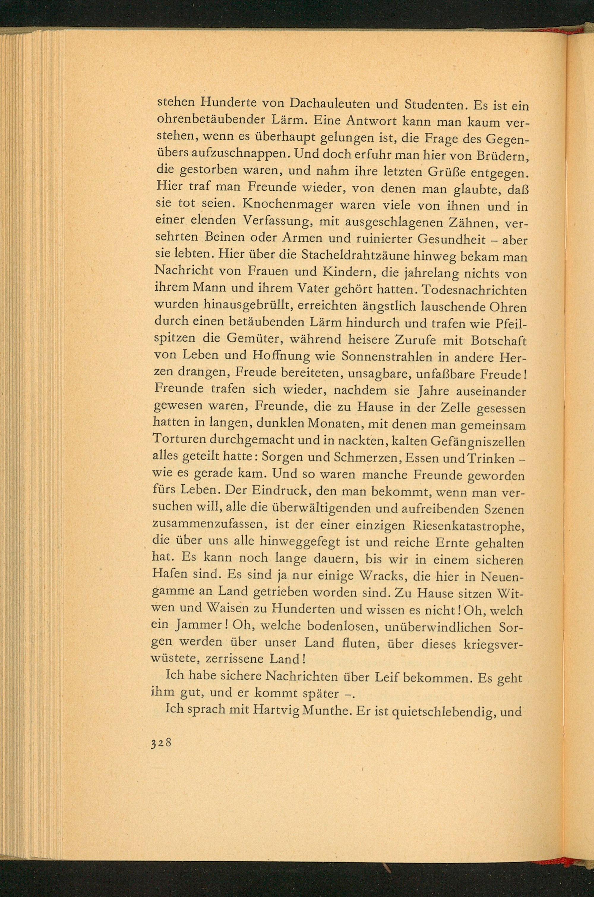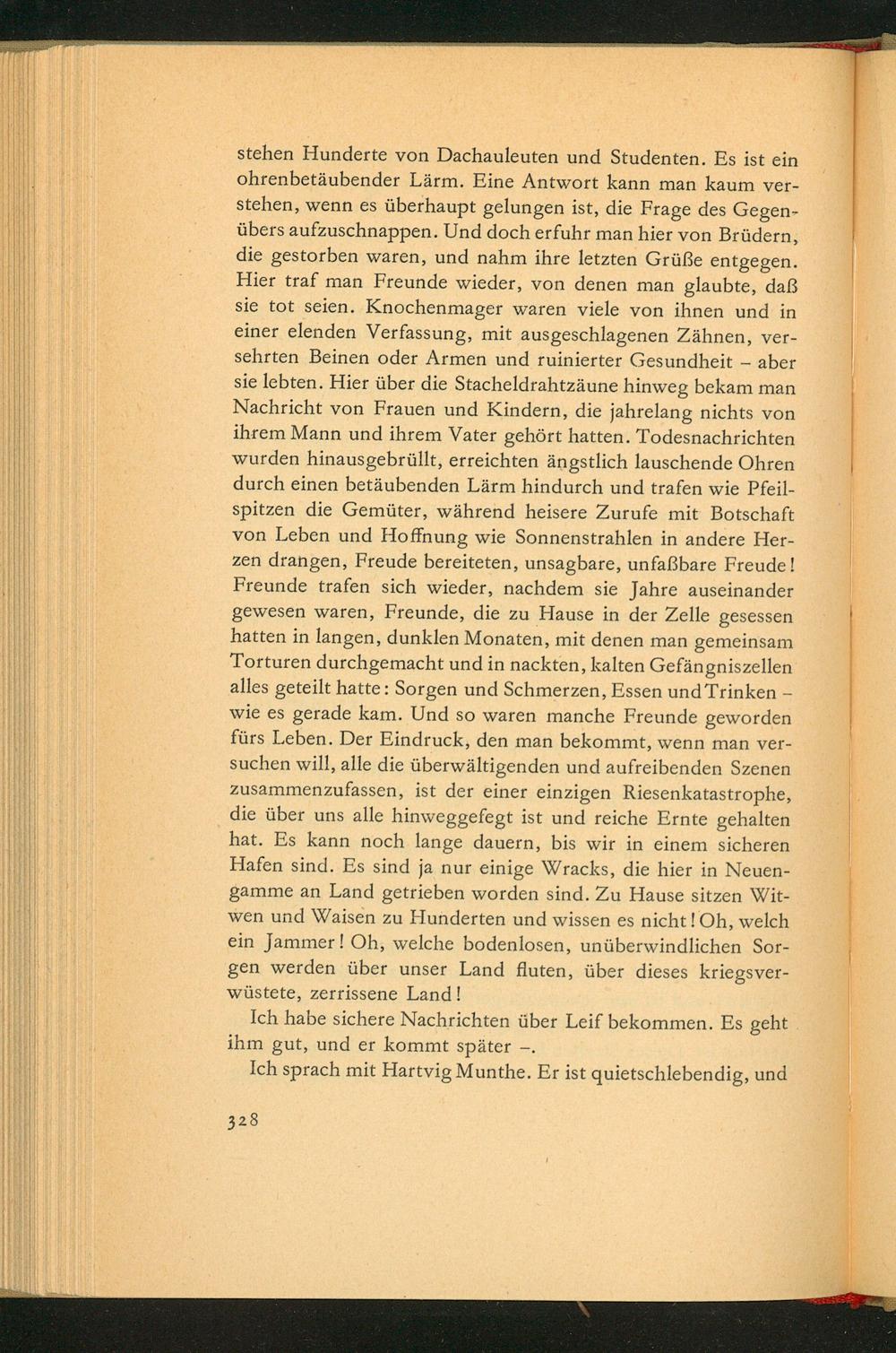 stehen Hunderte von Dachauleuten und Studenten. Es ist ein ohrenbetäubender Lärm. Eine Antwort kann man kaum ver- stehen, wenn es überhaupt gelungen ist, die Frage des Gegen- übers aufzuschnappen. Und doch erfuhr man hier von Brüdern, die gestorben waren, und nahm ihre letzten Grüße entgegen. Hier traf man Freunde wieder, von denen man glaubte, daß sie tot seien. Knochenmager waren viele von ihnen und in einer elenden Verfassung, mit ausgeschlagenen Zähnen, ver- sehrten Beinen oder Armen und ruinierter Gesundheit- aber sie lebten. Hier über die Stacheldrahtzäune hinweg bekam man Nachricht von Frauen und Kindern, die jahrelang nichts von ihrem Mann und ihrem Vater gehört hatten. Todesnachrichten wurden hinausgebrüllt, erreichten ängstlich lauschende Ohren durch einen betäubenden Lärm hindurch und trafen wie Pfeil- spitzen die Gemüter, während heisere Zurufe mit Botschaft von Leben und Hoffnung wie Sonnenstrahlen in andere Her- zen drangen, Freude bereiteten, unsagbare, unfaßbare Freude! Freunde trafen sich wieder, nachdem sie Jahre auseinander gewesen waren, Freunde, die zu Hause in der Zelle gesessen hatten in langen, dunklen Monaten, mit denen man gemeinsam Torturen durchgemacht und in nackten, kalten Gefängniszellen alles geteilt hatte: Sorgen und Schmerzen, Essen und Trinken- wie es gerade kam. Und so waren manche Freunde geworden fürs Leben. Der Eindruck, den man bekommt, wenn man ver- suchen will, alle die überwältigenden und aufreibenden Szenen zusammenzufassen, ist der einer einzigen Riesenkatastrophe, die über uns alle hinweggefegt ist und reiche Ernte gehalten hat. Es kann noch lange dauern, bis wir in einem sicheren Hafen sind. Es sind ja nur einige Wracks, die hier in Neuen- gamme an Land getrieben worden sind. Zu Hause sitzen Wit- wen und Waisen zu Hunderten und wissen es nicht!Oh, welch ein Jammer! Oh, welche bodenlosen, unüberwindlichen Sor- gen werden über unser Land fluten, über dieses kriegsver- wüstete, zerrissene Land!