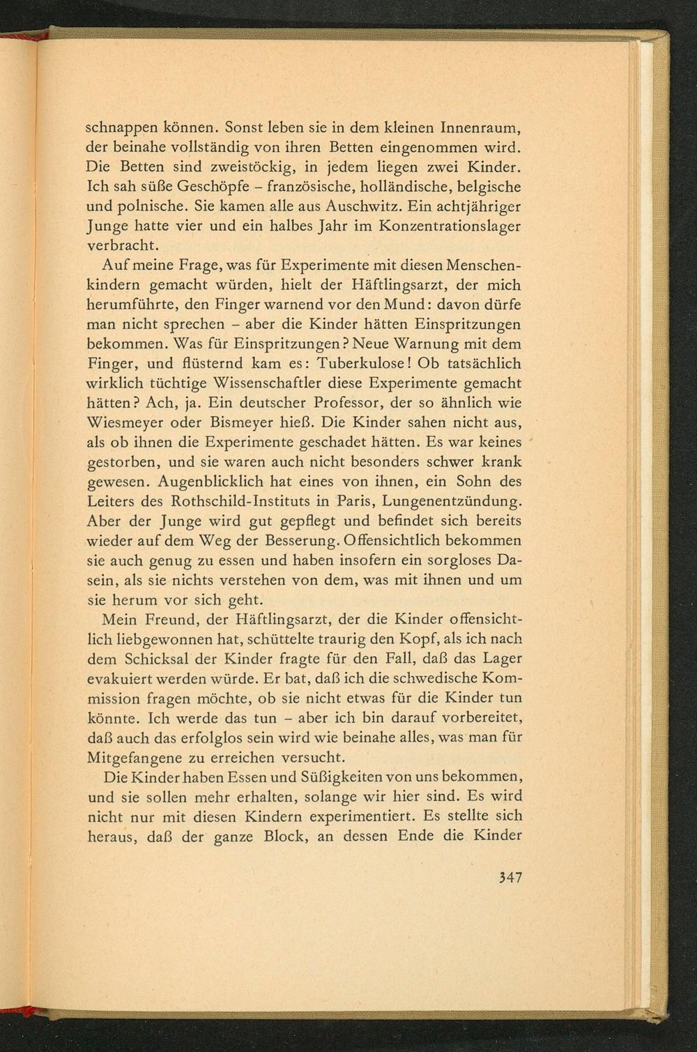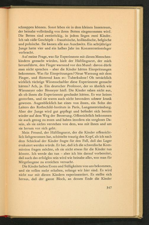 Auf meine Frage, was für Experimente mit diesen Menschenkindern gemacht würden, hielt der Häftlingsarzt, der mich herumführte, den Finger warnend vor den Mund: davon dürfe man nicht sprechen- aber die Kinder hätten Einspritzungen bekommen. Was für Einspritzungen? Neue Warnung mit dem Finger, und flüsternd kam es: Tuberkulose! Ob tatsächlich wirklich tüchtige Wissenschaftler diese Experimente gemacht hätten? Ach, ja. Ein deutscher Professor, der so ähnlich wie Wiesmeyer oder Bismeyer hieß. Die Kinder sahen nicht aus, als ob ihnen die Experimente geschadet hätten. Es war keines gestorben, und sie waren auch nicht besonders schwer krank gewesen. Augenblicklich hat eines von ihnen, ein Sohn des Leiters des Rothschild- Instituts in Paris , Lungenentzündung. Aber der Junge wird gut gepflegt und befindet sich bereits wieder auf dem Weg der Besserung. Offensichtlich bekommen sie auch genug zu essen und haben insofern ein sorgloses Dasein, als sie nichts verstehen von dem, was mit ihnen und um sie herum vor sich geht.