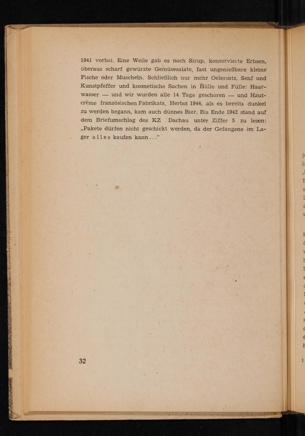 wasser— und wir wurden alle 14 Tage geschoren— und Haut- creme französischen Fabrikats, Herbst 1944, als es bereits dunkel zu werden begann, kam auch dünnes Bier. Bis Ende 1942 stand auf dem Briefumschlag des KZ Dachau unter Ziffer 5 zu lesen: „Pakete dürfen nicht geschickt werden, da der Gefangene im La- ger alles kaufen kann...”