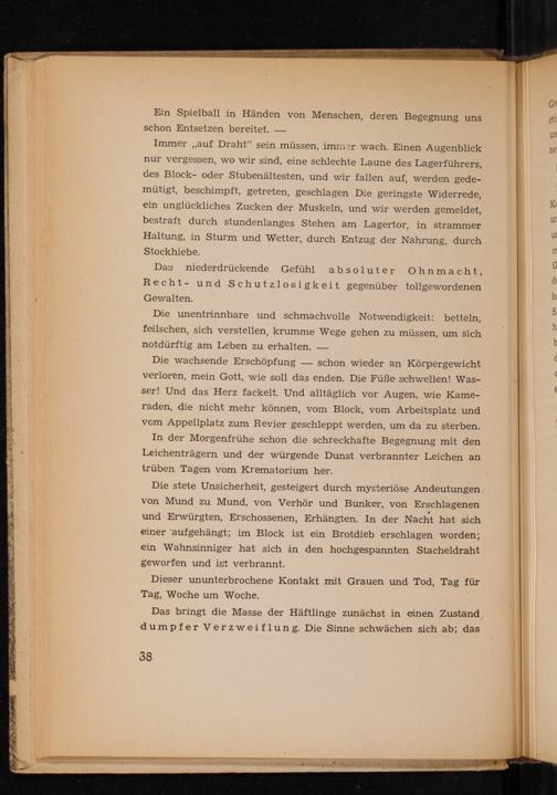 Die stete Unsicherheit, gesteigert durch mysteriöse Andeutungen von Mund zu Mund, von Verhör und Bunker, von Erschlagenen und Erwürgten, Erschossenen, Erhängten. In der Nacht hat sich einer' aufgehängt; im Block ist ein Brotdieb erschlagen worden; ein Wahnsinniger hat sich in den hochgespannten Stacheldraht geworfen und ist verbrannt.