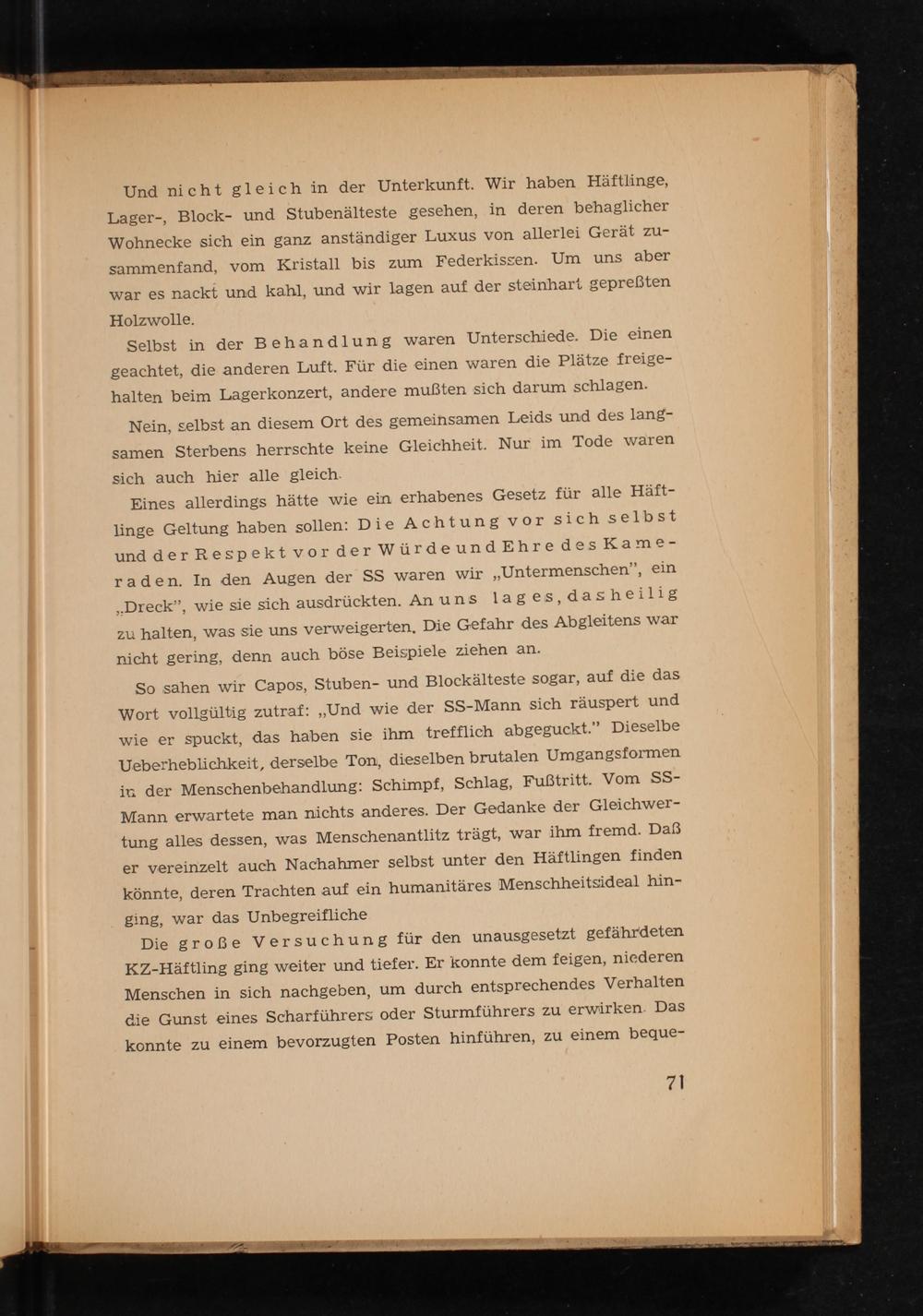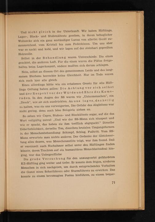 Eines allerdings hätte wie ein erhabenes Gesetz für alle Häftlinge Geltung haben sollen: Die Achtung vor sich selbst und der Respekt vor der Würde und Ehre des Kameraden. In den Augen der SS waren wir„, Untermenschen", ein ,, Dreck", wie sie sich ausdrückten. An uns lages, das heilig zu halten, was sie uns verweigerten. Die Gefahr des Abgleitens war nicht gering, denn auch böse Beispiele ziehen an.