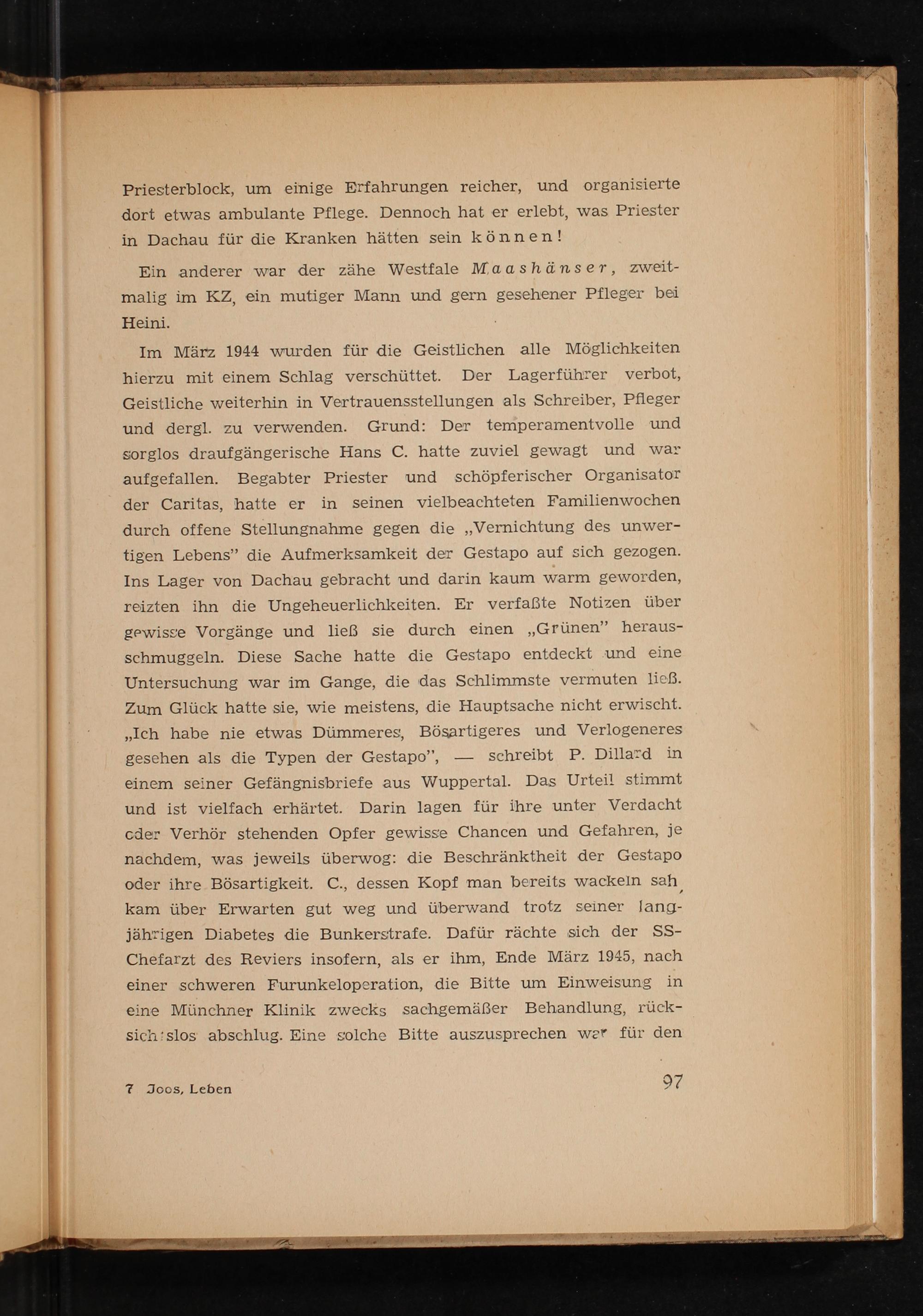Im März 1944 wurden für die Geistlichen alle Möglichkeiten hierzu mit einem Schlag verschüttet. Der Lagerführer verbot, Geistliche weiterhin in Vertrauensstellungen als Schreiber, Pfleger und dergl. zu verwenden. Grund: Der temperamentvolle und sorglos draufgängerische Hans C. hatte zuviel gewagt und war aufgefallen. Begabter Priester und schöpferischer Organisator der Caritas, hatte er in seinen vielbeachteten Familienwochen durch offene Stellungnahme gegen die ,, Vernichtung des unwertigen Lebens" die Aufmerksamkeit der Gestapo auf sich gezogen. Ins Lager von Dachau gebracht und darin kaum warm geworden, reizten ihn die Ungeheuerlichkeiten. Er verfaßte Notizen über gewisse Vorgänge und ließ sie durch einen„ Grünen" herausschmuggeln. Diese Sache hatte die Gestapo entdeckt und eine Untersuchung war im Gange, die das Schlimmste vermuten ließ. Zum Glück hatte sie, wie meistens, die Hauptsache nicht erwischt. ,, Ich habe nie etwas Dümmeres, Bösartigeres und Verlogeneres gesehen als die Typen der Gestapo ", schreibt P. Dillard in einem seiner Gefängnisbriefe aus Wuppertal . Das Urteil stimmt und ist vielfach erhärtet. Darin lagen für ihre unter Verdacht cder Verhör stehenden Opfer gewisse Chancen und Gefahren, je nachdem, was jeweils überwog: die Beschränktheit der Gestapo oder ihre Bösartigkeit. C., dessen Kopf man bereits wackeln sah kam über Erwarten gut weg und überwand trotz seiner langjährigen Diabetes die Bunkerstrafe. Dafür rächte sich der SSChefarzt des Reviers insofern, als er ihm, Ende März 1945, nach einer schweren Furunkeloperation, die Bitte um Einweisung in eine Münchner Klinik zwecks sachgemäßer Behandlung, rücksich slos abschlug. Eine solche Bitte auszusprechen war für den