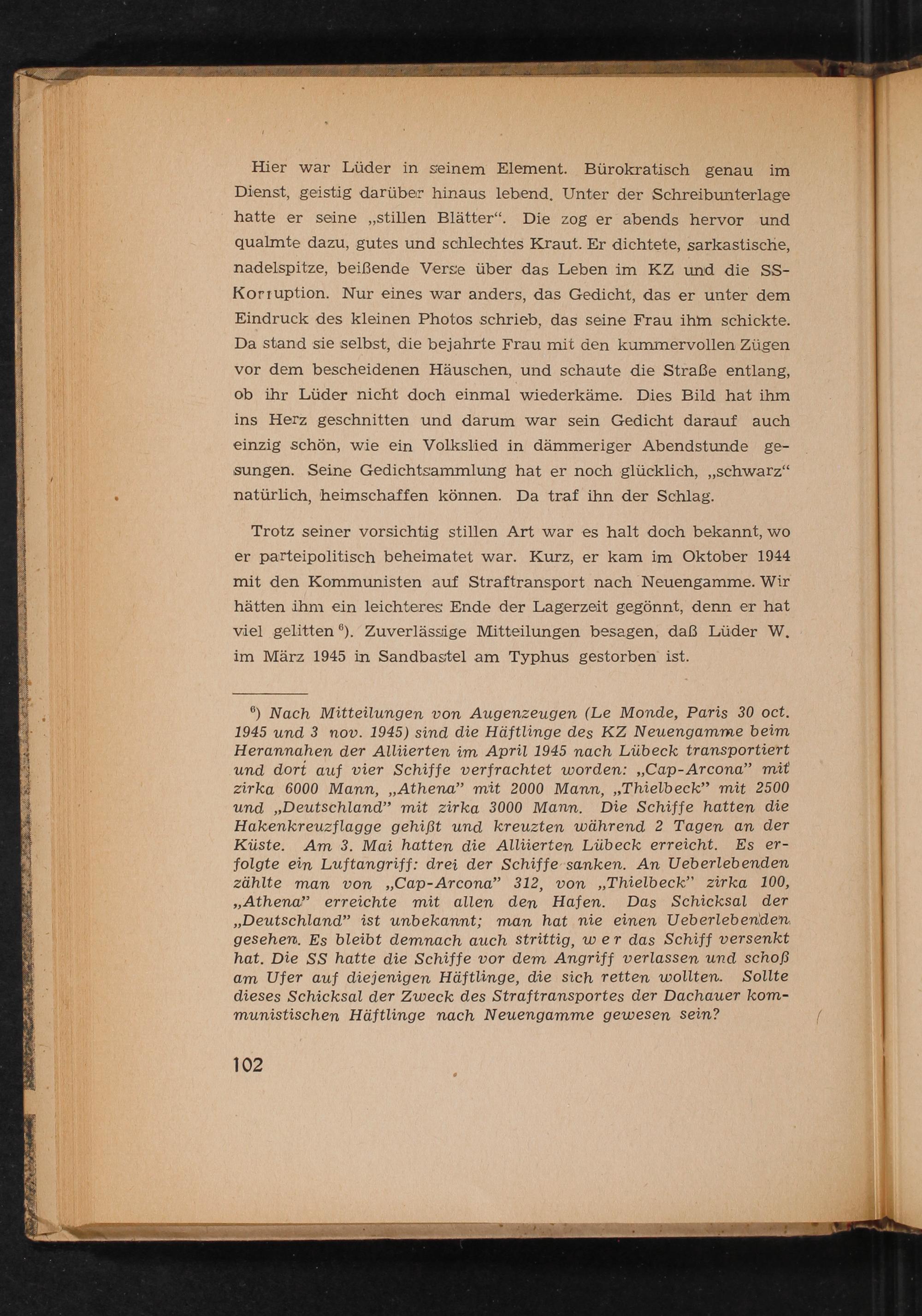 6) Nach Mitteilungen von Augenzeugen( Le Monde, Paris 30 oct. 1945 und 3 nov. 1945) sind die Häftlinge des KZ Neuengamme beim Herannahen der Alliierten im April 1945 nach Lübeck transportiert und dort auf vier Schiffe verfrachtet worden: ,, Cap- Arcona " mit zirka 6000 Mann ,,, Athena" mit 2000 Mann ,,, Thielbeck" mit 2500 und ,, Deutschland " mit zirka 3000 Mann. Die Schiffe hatten die Hakenkreuzflagge gehißt und kreuzten während 2 Tagen an der Küste. Am 3. Mai hatten die Alliierten Lübeck erreicht. Es erfolgte ein Luftangriff: drei der Schiffe sanken. An Ueberlebenden zählte man von ,, Cap- Arcona " 312, von" Thielbeck" zirka 100, ,, Athena" erreichte mit allen den Hafen. Das Schicksal der ,, Deutschland " ist unbekannt; man hat nie einen Ueberlebenden gesehen. Es bleibt demnach auch strittig, wer das Schiff versenkt hat. Die SS hatte die Schiffe vor dem Angriff verlassen und schoẞ am Ufer auf diejenigen Häftlinge, die sich retten wollten. Sollte dieses Schicksal der Zweck des Straftransportes der Dachauer kommunistischen Häftlinge nach Neuengamme gewesen sein?