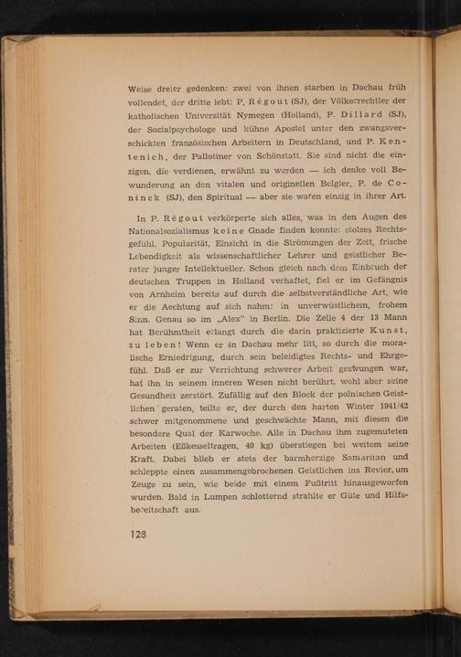 Weise dreier gedenken: zwei von ihnen starben in Dachau früh vollendet, der dritte lebt: P. Régout( SJ), der Völkerrechtler der katholischen Universität Nymegen( Holland ), P. Dillard( SJ), der Sozialpsychologe und kühne Apostel unter den zwangsver­schickten französischen Arbeitern in Deutschland, und P. Ken­tenich, der Pallotiner von Schönstatt . Sie sind nicht die ein­zigen, die verdienen, erwähnt zu werden ich denke voll Be­wunderung an den vitalen und originellen Belgier, P. de Co­ninck( SJ), den Spiritual aber sie waren einzig in ihrer Art.